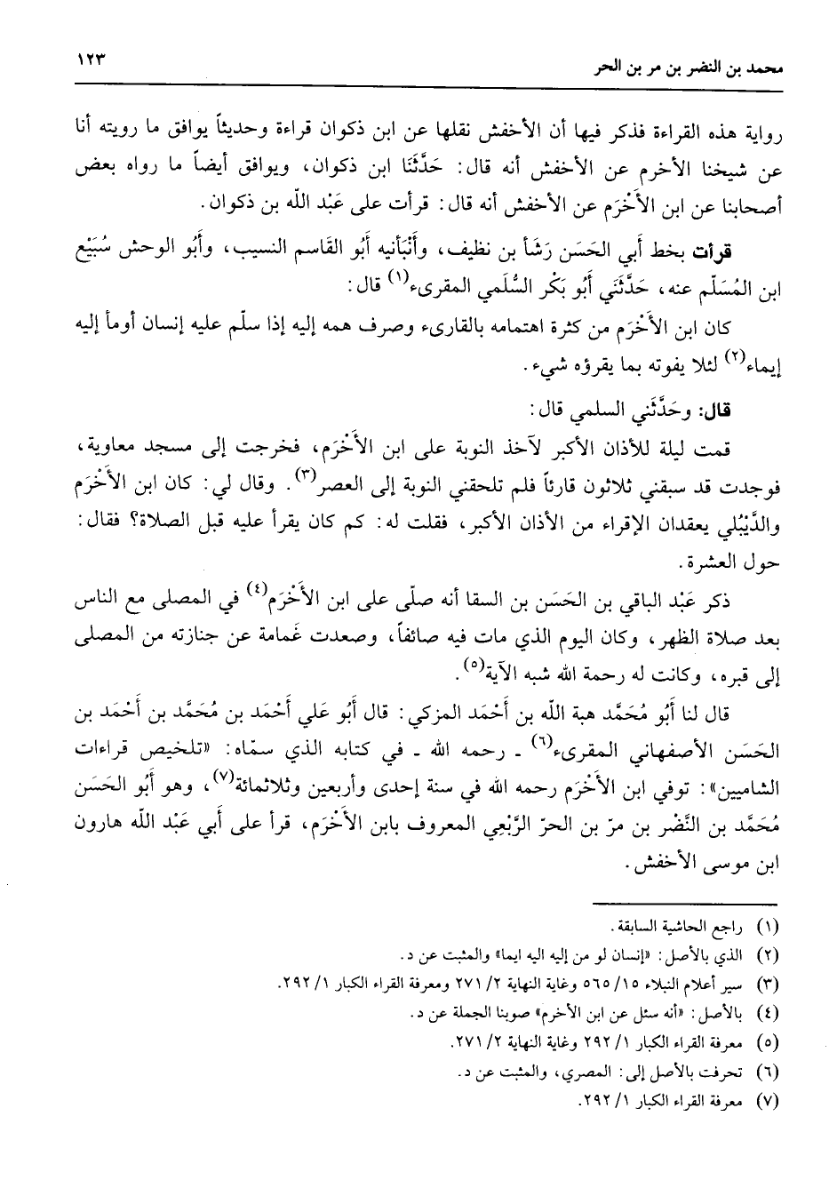 رواية هذه القراءة فذكر فيها أن الأخفش نقلها عن ابن ذكوان قراءة وحديثا يوافق ما رويته أنا عن شيخنا الأخرم عن الأخفش أنه قال حدثنا ابن ذكوان ويوافق أيضا ما رواه بعض أصحابنا عن ابن الأخرم عن الأخفش أنه قال قرأت على عبد الله بن ذكوان قرأت بخط أبي الحسن رشأ بن نظيف وأنبأنيه أبو القاسم النسيب وأبو الوحش سبيع ابن المسلم عنه حدثني أبو بكر السلمي المقرئ (1) قال كان ابن الأخرم من كثرة اهتمامه بالقارئ وصرف همه إليه إذا سلم عليه إنسان أومأ إليه إيماء (2) لئلا يفوته بما يقرؤه شئ قال وحدثني السلمي قال قمت ليلة للأذان الأكبر لآخذ النوبة على ابن الأخرم فخرجت إلى مسجد معاوية فوجدت قد سبقني ثلاثون قارئا فلم تلحقني النوبة إلى العصر (3) وقال لي كان ابن الأخرم والديبلي يعقدان الإقراء من الأذان الأكبر فقلت له كم كان يقرأ عليه قبل الصلاة فقال حول العشرة ذكر عبد الباقي بن الحسن بن السقا أنه صلى على ابن الأخرم (4) في المصلى مع الناس بعد صلاة الظهر وكان اليوم الذي مات فيه صائفا وصعدت غمامة عن جنازته من المصلى إلى قبره وكانت له رحمة الله شبه الآية (5) قال لنا أبو محمد هبة الله بن أحمد المزكي قال أبو علي أحمد بن محمد بن أحمد بن الحسن الأصفهاني المقرئ (6) حمه الله في كتابه الذي سماه تلخيص قراءات الشاميين توفي ابن الأخرم رحمه الله في سنة إحدى وأربعين وثلاثمائة وهو أبو الحسن محمد بن النضر بن مر بن الحر الربعي المعروف بابن الأخرم قرأ على أبي عبد الله هارون ابن موسى الأخفش