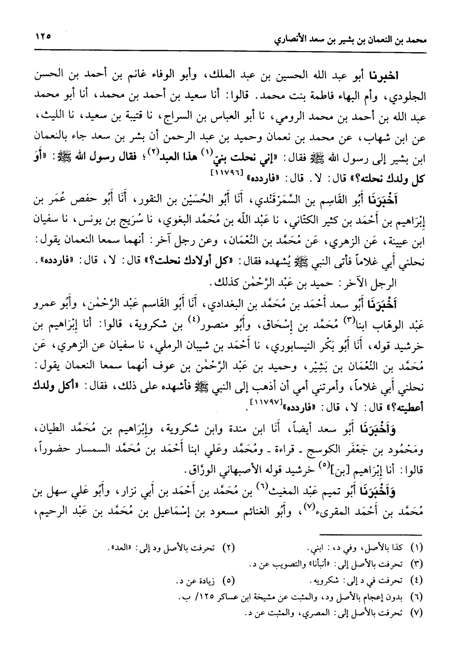 أخبرنا أبو عبد الله الحسين بن عبد الملك وأبو الوفاء غانم بن أحمد بن الحسن الجلودي وأم البهاء فاطمة بنت محمد قالوا أنا سعيد بن أحمد بن محمد أنا أبو محمد عبد الله بن أحمد بن محمد الرومي نا أبو العباس بن السراج نا قتيبة بن سعيد نا الليث عن ابن شهاب عن محمد بن نعمان وحميد بن عبد الرحمن أنا بشر بن سعد جاء بالنعمان ابن بشير إلى رسول الله (صلى الله عليه وسلم) فقال إني نحلت بني (1) هذا العبد (2) فقال رسول الله (صلى الله عليه وسلم) أو كل ولدك نحلته قال لا قال فاردده أخبرنا أبو القاسم بن السمرقندي أنا أبو الحسن بن النقور أنا أبو حفص عمر بن إبراهيم بن أحمد بن كثير الكتاني نا عبد الله بن محمد البغوي نا سريج بن يونس نا سفيان ابن عيينة عن الزهري عن محمد بن النعمان وعن رجل آخر أنهما سمعا النعمان يقول نحلني أبي غلاما فأتى النبي (صلى الله عليه وسلم) يشهده فقال كل أولادك نحلت قال لا قال فاردده الرجل الآخر حميد بن عبد الرحمن كذلك أخبرنا أبو سعد أحمد بن محمد بن البغدادي أنا أبو القاسم عبد الرحمن وأبو عمرو عبد الوهاب ابنا (3) محمد بن إسحاق وأبو منصور (4) بن شكروية قالوا أنا إبراهيم بن خرشيد قوله أنا أبو بكر النيسابوري نا أحمد بن شيبان الرملي نا سفيان عن الزهري عن محمد بن النعمان بن بشير وحميد بن عبد الرحمن بن عوف أنهما سمعا النعمان يقول نحلني أبي غلاما وأمرتني أمي أن أذهب إلى النبي (صلى الله عليه وسلم) فأشهده على ذلك فقال أكل ولدك أعطيته قال لا قال فاردده وأخبرنا أبو سعد أيضا أنا ابن مندة وابن شكروية وإبراهيم بن محمد الطيان ومحمود بن جعفر الكوسج قراءة ومحمد وعلي ابنا أحمد بن أحمد بن محمد السمسار حضورا قالوا أنا إبراهيم بن (5) خرشيد قوله الأصبهاني الوراق وأخبرنا أبو تميم عبد المغيث (6) بن محمد بن أحمد بن أبي نزار وأبو علي سهل بن محمد بن أحمد المقرئ (7) وأبو الغنائم مسعود بن إسماعيل بن محمد بن عبد الرحيم