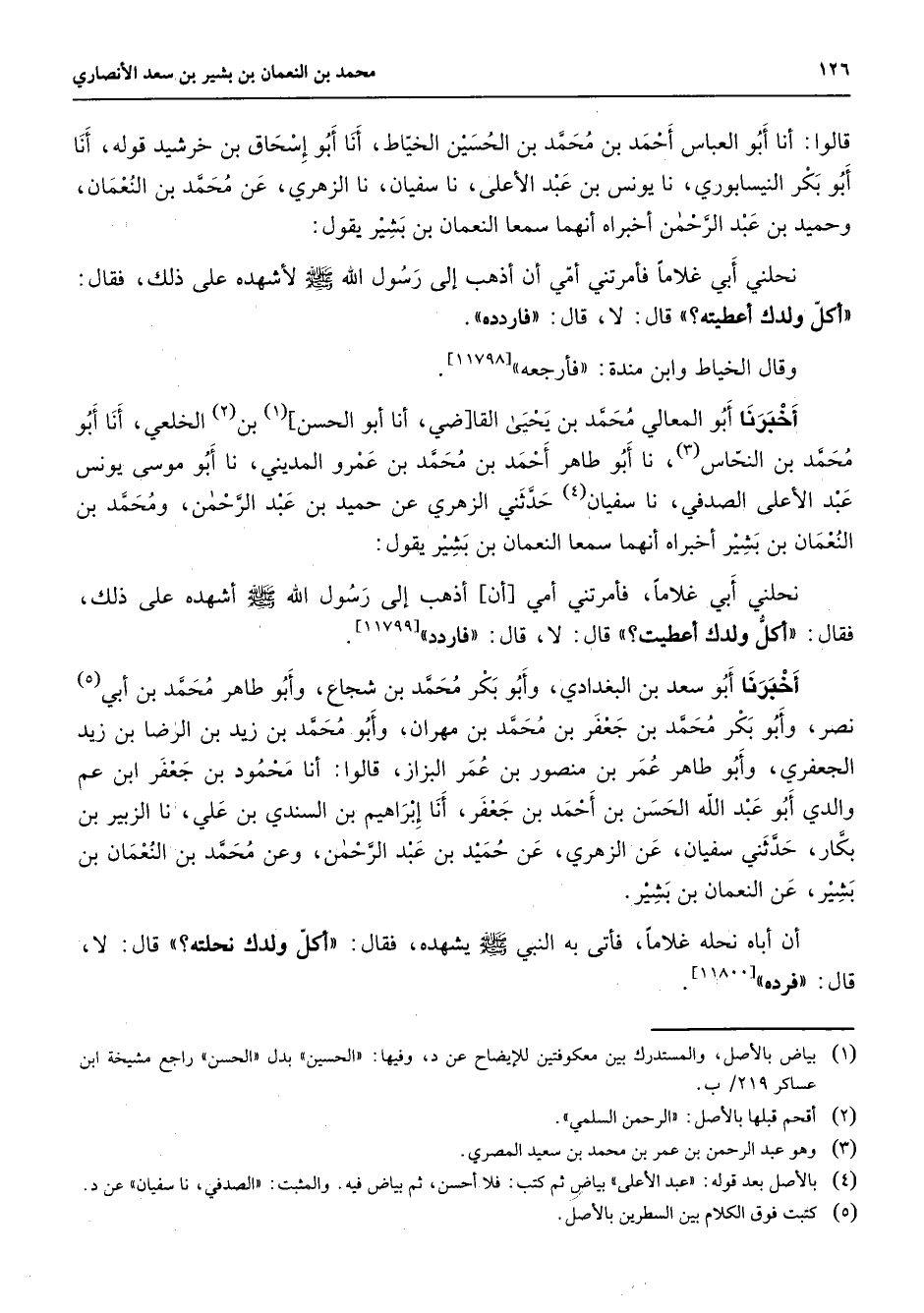 قالوا أنا أبو العباس أحمد بن محمد بن الحسين الخياط أنا أبو إسحاق بن خرشيد قوله أنا أبو بكر النيسابوري نا يونس بن عبد الأعلى نا سفيان نا الزهري عن محمد بن النعمان وحميد بن عبد الرحمن أخبراه أنهما سمعا النعمان بن بشير يقول نحلني أبي غلاما فأمرتني أمي أن أذهب إلى رسول الله (صلى الله عليه وسلم) لأشهده على ذلك فقال أكل ولدك أعطيته قال لا قال فاردده وقال الخياط وابن مندة فأرجعه أخبرنا أبو المعالي محمد بن يحيى القاضي أنا أبو الحسن (1) بن (2) الخلعي أنا أبو محمد بن النحاس (3) نا أبو طاهر أحمد بن محمد بن عمرو المديني نا أبو موسى يونس عبد الأعلى الصدفي نا سفيان (4) حدثني الزهري عن حميد بن عبد الرحمن ومحمد بن النعمان بن بشير أخبراه أنهما سمعا النعمان بن بشير يقول نحلني أبي غلاما فأمرتنا أمي أن أذهب إلى رسول الله (صلى الله عليه وسلم) أشهده على ذلك فقال أكل ولدك أعطيت قال لا قال فاردده أخبرنا أبو سعد بن البغدادي وأبو بكر محمد بن شجاع وأبو طاهر محمد بن أبي (5) نصر وأبو بكر محمد بن جعفر بن محمد بن مهران وأبو محمد زيد بن الرضا بن زيد الجعفري وأبو طاهر عمر بن منصور بن عمر البزاز قالوا أنا محمود بن جعفر ابن عم والدي أبو عبد الله الحسن بن أحمد بن جعفر أنا إبراهيم بن السندي بن علي نا الزبير بن بكار حدثني سفيان عن الزهري عن حميد بن عبد الرحمن وعن محمد بن النعمان بن بشير عن النعمان بن بشير أن أباه نحله غلاما فأتى به النبي (صلى الله عليه وسلم) يشهده فقال أكل ولدك نحلته قال لا قال فرده