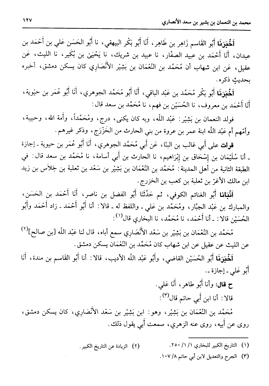 أخبرنا أبو القاسم زاهر بن طاهر أنا أبو بكر البيهقي نا أبو الحسن علي بن أحمد بن عبدان أنا أحمد بن عبيد الصفار نا عبيد بن شريك نا يحيى بن بكير نا الليث عن عقيل عن ابن شهاب أن محمد بن النعمان بن بشير الأنصاري كان يسكن دمشق أخبره بحديث ذكره أخبرنا أبو بكر محمد بن عبد الباقي أنا أبو محمد الجوهري أنا أبو عمر بن حيوية أنا أحمد بن معروف نا الحسين بن فهم نا محمد بن سعد قال فولد النعمان بن بشير عبد الله وبه كان يكنى درج ومحمدا وأمة الله وحبيبة وأمهم أم عبد الله ابنة عمرو بن عروة من بني الحارث من الخزرج وذكر غيرهم قرأت على أبي غالب بن البنا عن أبي محمد الجوهري أنا أبو عمر بن حيوية إجازة أنا سليمان بن إسحاق بن إبراهيم نا الحارث بن أبي أسامة نا محمد بن سعد قال في الطبقة الثانية من أهل المدينة محمد بن النعمان بن بشير بن سعد بن ثعلبة بن خلاس بن زيد ابن مالك الأغر بن ثعلبة بن كعب بن الخزرج أنبأنا أبو الغنائم الكوفي ثم حدثنا أبو الفضل بن ناصر أنا أحمد بن الحسن والمبارك بن عبد الجبار ومحمد بن علي واللفظ له قالا أنا أبو أحمد زاد أحمد وأبو الحسين قالا أنا أحمد نا محمد نا البخاري قال (1) محمد بن النعمان بن بشير بن سعد الأنصاري سمع أباه قال لنا عبد الله بن صالح (2) عن الليث عن عقيل عن ابن شهاب كان محمد بن النعمان يسكن دمشق أخبرنا أبو الحسين القاضي وأبو عبد الله الأديب قالا أنا أبو القاسم بن مندة أنا أبو علي إجازة قال وأنا أبو طاهر أنا علي قالا أنا ابن أبي حاتم قال (3) محمد بن النعمان بن بشير وهو ابن بشير بن سعد الأنصاري كان يسكن دمشق روى عن أبيه روى عنه الزهري سمعت أبي يقول ذلك