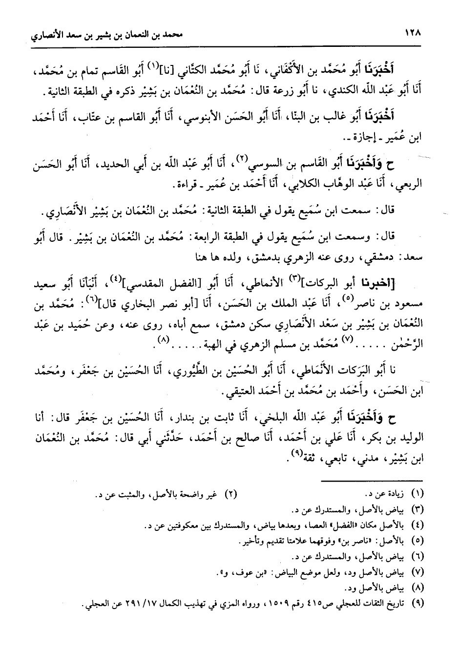 أخبرنا أبو محمد بن الأكفاني نا أبو محمد الكتاني نا (1) أبو القاسم تمام بن محمد أنا أبو عبد الله الكندي نا أبو زرعة قال محمد بن النعمان بن بشير ذكره في الطبقة الثانية أخبرنا أبو غالب بن البنا أنا أبو الحسن الأبنوسي أنا أبو القاسم بن عتاب أنا أحمد ابن عمير إجازة وأخبرنا أبو القاسم بن السوسي (2) أنا أبو عبد الله بن أبي الحديد أنا أبو الحسن الربعي أنا أبو عبد الوهاب الكلابي أنا أحمد بن عمير قراءة قال سمعت ابن سميع يقول في الطبقة الثاني محمد بن النعمان ببشير الأنصاري قال وسمعت ابن سميع يقول في الطبقة الرابعة محمد بن النعمان بن بشير قال أبو سعد دمشقي روى عنه الزهري بدمشق ولده ها هنا أخبرنا أبو البركات (3) الأنماطي أنا أبو الفضل المقدسي (4) أنبأنا بو سعيد مسعود بن ناصر (5) أنا عبد الملك بن الحسن أنا أبو نصر البخاري قال (6) محمد بن النعمان بن بشير بن سعد الأنصاري سكن دمشق سمع أباه روى عنه وعن حميد بن عبد الرحمن (7) محمد بن مسلم الزهري في الهبة (8) نا أبو البركات الأنماطي أنا أبو الحسين بن الطيوري أنا الحسين بن جعفر ومحمد ابن الحسن وأحمد بن محمد بن أحمد العتيقي وأخبرنا أبو عبد الله البلخي أنا ثابت بن بندار أنا الحسين بن جعفر قال أنا الوليد بن بكر أنا علي بن أحمد أنا صالح بن أحمد حدثني أبي قال محمد بن النعمان ابن بشير مدني تابعي ثقة (9)
