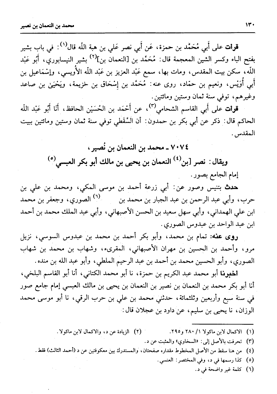 7074 - محمد بن النعمان بن نصير ويقال نصر بن (4) النعمان بن يحيى بن مالك أبو بكر العبسي (5) إمام الجامع بصور حدث بتنيس وصور عن أبي زرعة أحمد بن موسى المكي ومحمد بن علي بن حرب وأبي عبد الرحمن بن عبد الجبار بن محمد بن (6) الصوري وجعفر بن محمد ابن علي الهمداني وأبي سهل سعيد بن الحسن الأصبهاني وأبي عبد الملك محمد بن أحمد ابن عبد الواحد بن عبدوس الصوري روى عنه تمام بن محمد وأبو بكر أحمد بن محمد بن عبدوس السوسي نزيل مرو وأحمد بن الحسين بن مهران الأصبهاني المقرئ وشهاب بن محمد بن شهاب الصوري وأبو الحسين محمد بن أحمد بن عبد الرحيم الملطي وأبو عبد الله بن مندة أخبرنا أبو محمد عبد الكريم بن حمزة نا أبو محمد الكتاني أنا أبو القاسم البلخي أنا أبو بكر محمد بن النعمان بن نصير بن النعمان بن يحيى بن مالك العبسي إمام جامع صور في سنة سبع وأربعين وثلثمائة حدثني محمد بن علي بن حرب الرقي نا أبو موسى محمد الوزان نا يحيى بن سليم عن داود بن عجلان قال