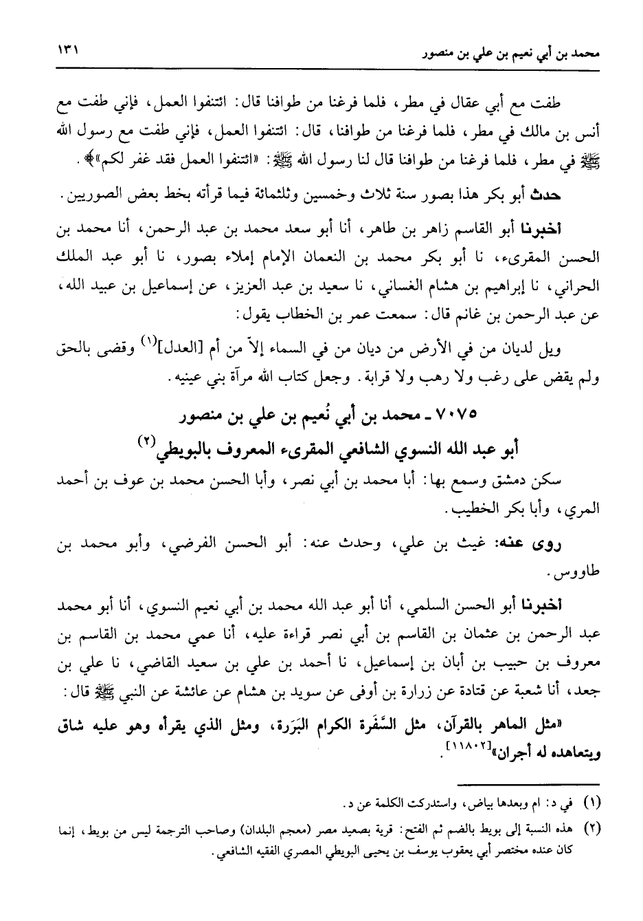 طفت مع أبي عقال في مطر فلما فرغنا من طوافنا قال ائتنفوا العمل فإني طفت مع أنس بن مالك في مطر فلما فرغنا من طوافنا قال ائتنفوا العمل فإني طفت مرسول الله (صلى الله عليه وسلم) في مطر فلما فرغنا من طوافنا قال لنا رسول الله (صلى الله عليه وسلم) ائتنفوا العمل فقد غفر لكم حدث أبو بكر هذا بصور سنة ثلاث وخمسين وثلاثمائة فيما قرأته بخط بعض الصوريين أخبرنا أبو القاسم زاهر بن طاهر أنا أبو سعد محمد بن عبد الرحمن أنا محمد بن الحسن المقرئ نا أبو بكر محمد بن النعمان الإمام إملاء بصور نا أبو عبد الملك الحراني نا إبراهيم بن هشام الغساني نا سعيد بن عبد العزيز عن إسماعيل بن عبيد الله عن عبد الرحمن بن غانم قال سمعت عمر بن الخطاب يقول ويل لديان من في الأرض من ديان من في السماء إلا من أم العدل وقضى بالحق ولم يقض على رغب ولا رهب ولا قرابة وجعل كتاب الله مرآة بني عينيه 7075 - محمد بن أبي نعيم بن علي بن منصور أبو عبد الله النسوي الشافعي المقرئ المعروف بالبويطي (2) سكن دمشق وسمح بها أبا محمد بن أبي نصر وأبا الحسن محمد بن عوف بن أحمد المري وأبا بكر الخطيب روى عنه غيث بن علي وحدث عنه أبو الحسن الفرضي وأبو محمد بن طاووس أخبرنا أبو الحسن السلمي أنا أبو عبد الله محمد بن أبي نعيم النسوي أنا أبو محمد عبد الرحمن بن عثمان بن القاسم بن أبي نصر قراءة عليه أنا عمي محمد بن القاسم بن معروف بن حبيب بن أبان بن إسماعيل نا أحمد بن علي بن سعيد القاضي نا علي بن جعد أنا شعبة عن قتادة عن زرارة بن أوفى عن سويد بن هشام عن عائشة عن النبي (صلى الله عليه وسلم) قال مثل الماهر بالقرآن مثل السفرة الكرام البررة ومثل الذي يقرأه وهل عليه شاق ويتعاهده له أجران