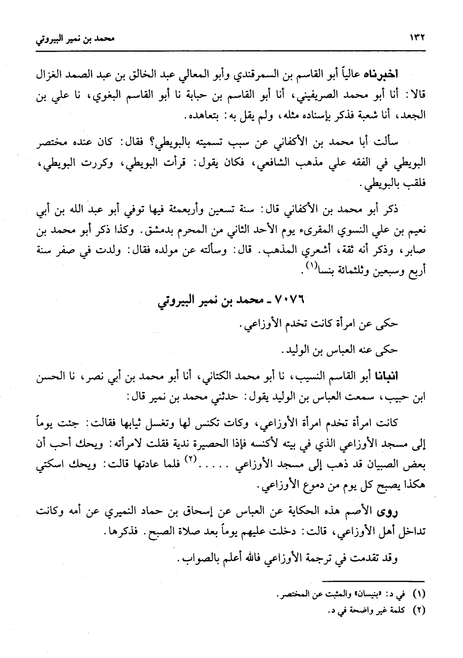 أخبرناه عاليا أبو القاسم بن السمرقندي وأبو المعالي عبد الخالق بن عبد الصمد الغزال قالا أنا أبو محمد الصريفيني أنا أبو القاسم بن حبابة نا أبو القاسم البغوي نا علي بن الجعد أنا شعبة فذكر بإسناده مثله ولم يقل به بتعاهده سألت أبا محمد بن الأكفاني عن سبب تسميته بالبويطي فقال كان عنده مختصر البويطي في الفقه على مذهب الشافعي فكان يقول قرأت البويطي وكررت البويطي فلقب بالبويطي ذكر أبو محمد بن الأكفاني قال سنة تسعين وأربعمئة فيها توفي أبو عبد الله بن أبي نعيم بن علي النسوي المقرئ يوم الأحد الثاني من المحرم بدمشق وكذا ذكر أبو محمد بن صابر وذكر أنه ثقة أشعري المذهب قال وسألته عن مولده فقال ولدت في صفر سنة أربع وسبعين وثلثمائة بنسا (1) 7076 - محمد بن نمير البيروتي حكى عن امرأة كانت تخدم الأوزاعي حكى عنه العباس بن الوليد أنبأنا أبو القاسم النسيب نا أبو محمد الكتاني أنا أبو محمد بن أبي نصر نا الحسن ابن حبيب سمعت العباس بن الوليد يقول حدثني محمد بن نمير قال كانت امرأة تخدم امرأة الأوزاعي وكانت تكنس لها وتغسل ثيابها فقالت جئت يوما إلى مسجد الأوزاعي الذي في بيته لأكنسه فإذا الحصيرة ندية فقلت لامرأته ويحك أحب أن بعض الصبيان قد ذهب إلى مسجد الأوزاعي (2) فلما عادتها قالت ويحك اسكتي هكذا يصبح كل يوم من دموع الأوزاعي روى الأصم هذه الحكاية عن العباس عن إسحاق بن حماد النميري عن أمه وكانت تداخل أهل الأوزاعي قالت دخلت عليهم يوما بعد صلاة الصبح فذكرها وقد تقدمت في ترجمة الأوزاعي فالله أعلم بالصواب