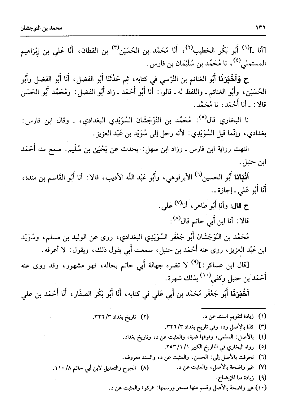 أنا (1) أبو بكر الخطيب (2) أنا محمد بن الحسين (3) بن القطان أنا علي بن إبراهيم المستملي (4) نا محمد بن سليمان بن فارس وأخبرنا أبو الغنائم بن النرسي في كتابه ثم حدثنا أبو الفضل أنا أبو الفضل وأبو الحسين وأبو الغنائم واللفظ له قالوا أنا أبو أحمد زاد أبو الفضل ومحمد أبو الحسن قالا أنا أحمد نا محمد نا البخاري قال (5) محمد بن النوجشان السويدي البغدادي وقال ابن فارس بغدادي وإنما قيل السويدي لأنه رحل إلى سويد بن عبد العزيز انتهت رواية ابن فارس وزاد ابن سهل يحدث عن يحيى بن سليم سمع منه أحمد ابن حنبل أنبأنا أبو الحسين (6) الأبرقوهي وابو عبد الله الأديب قالا أنا أبو القاسم بن مندة أنا أبو علي إجازة قال وأنا أبو طاهر أنا (7) علي قالا أنا ابن ابي حاتم قال (8) محمد بن النوجشان أبو جعفر السويدي البغدادي روى عن الوليد بن مسلم وسويد ابن عبد العزيز روى عنه أحمد بن حنبل سمت أبي يقول ذلك ويقول لا أعرفه قال ابن عساكر (9) لا تضره جهالة أبي حاتم بحاله فهو مشهور وقد روى عنه أحمد بن حنبل وكفى (10) بذلك شهرة أخبرنا أبو جعفر محمد بن أبي علي في كتابه أنا أبو بكر الصفار أنا أحمد بن علي