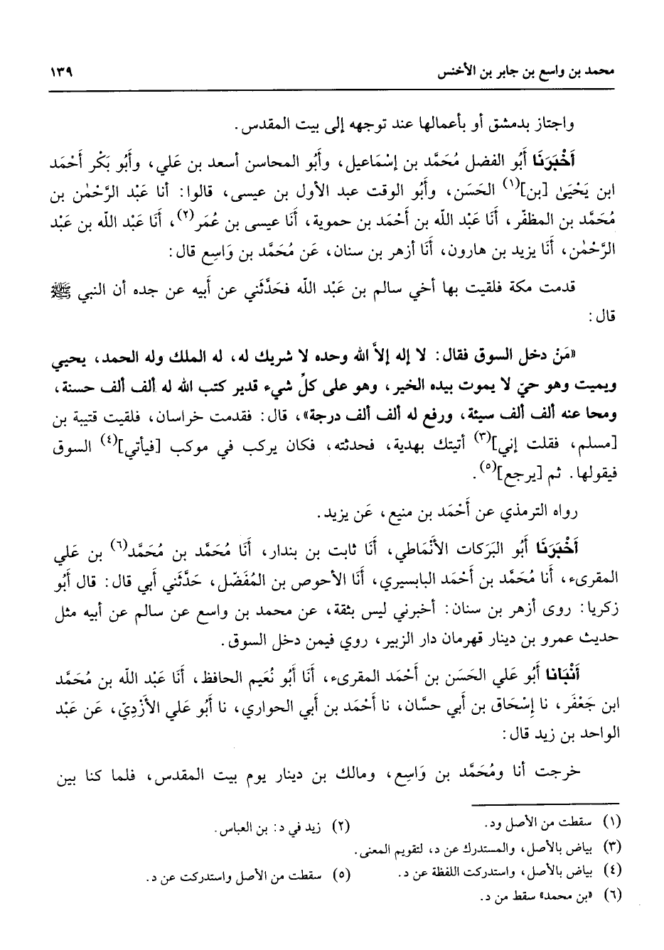 واجتاز بدمشق أو بأعمالها عند توجهه إلى بيت المقدس أخبرنا أبو الفضل محمد بن إسماعيل وأبو المحاسن أسعد بن علي وأبو بكر أحمد ابن يحيى بن (1) الحسن وأبو الوقت عبد الأول بن عيسى قالوا أنا عبد الرحمن بن محمد بن المظفر أنا عبد الله بن أحمد بن حموية أنا عيسى بن عمر (2) أنا عبد الله بن عبد الرحمن أنا يزيد بن هارون أنا أزهر بن سنان عن محمد بن واسع قال قدمت مكة فلقيت بها أخي سالم بن عبد الله فحدثني عن أبيه عن جده أن النبي (صلى الله عليه وسلم) قال من دخل السوق فقال لا إله إلا الله وحده لا شريك له له الملك وله الحمد يحيي ويميت وهو حي لا يموت بيده الخير وهو على كل شئ قدير كتب الله له ألف ألف حسنة ومحا عنه ألف ألف سيئة ورفع له ألف ألف درجة قال فقدمت خراسان فلقيت قتيبة بن مسلم فقلت إني (3) أتيتك بهدية فحدثته فكان يركب في موكب فيأتي (4) السوق فيقولها ثم يرجع (5) رواه الترمذي عن أحمد بن منيع عن يزيد أخبرنا أبو البركات الأنماطي أنا ثابت بن بندار أنا محمد بن محمد (6) بن علي المقرئ أنا محمد بن أحمد البابسيري أنا الأحوص بن المفضل حدثني أبي قال قال أبو زكريا روى أزهر بن سنان أخبرني ليس بثقة عن محمد بن واسع عن سالم عن أبيه مثل حديث عمرو بن دينار قهرمان دار الزبير روي فيمن دخل السوق أنبأنا أبو علي الحسن بن أحمد المقرئ أنا أبو نعيم الحافظ أنا عبد الله بن محمد ابن جعفر نا إسحاق بن أبي حسان نا أحمد بن أبي الحواري نا أبو علي الأزدي عن عبد الواحد بن زيد قال خرجت أنا ومحمد بن واسع ومالك بن دينار يوم بيت المقدس فلما كنا بين