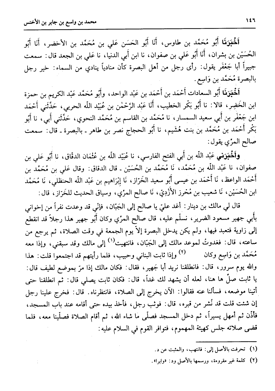 أخبرنا أبو محمد بن طاووس أنا أبو الحسن علي بن محمد بن الأخضر أنا أبو الحسين بن بشران أنا أبو علي بن صفوان نا ابن أبي الدنيا نا علي بن الجعد قال سمعت جبيرا أبا جعفر يقول رأى رجل من أهل البصرة كأن مناديا ينادي من السماء خير رجل بالبصرة محمد بن واسع أخبرنا أبو السعادات أحمد بن أحمد بن عبد الواحد وأبو محمد عبد الكريم بن حمزة ابن الخضر قالا نا أبو بكر الخطيب أنا عبد الرحمن بن عبيد الله الحربي حدثني أحمد ابن جعفر بن أبي سعيد السمسار نا محمد بن القاسم بن محمد النحوي حدثني أبي نا أبو بكر أحمد بن محمد بن بنت هشيم نا أبو الحجاج نصر بن طاهر بالبصرة قال سمعت صالح المري يقول وأخبرني عبد الله بن أبي الفتح الفارسي نا عبيد الله بن عثمان الدقاق نا أبو علي بن صفوان نا عبد الله بن محمد نا محمد بن الحسين قال الدقاق وقال علي بن محمد بن أحمد الواعظ نا أحمد بن عيسى أبو سعيد الخراز نا إبراهيم بن عبد الله الحنظلي نا محمد ابن الحسين نا شعيب بن محرز الأزدي نا صالح المري وسياق الحديث للخراز قال قال لي مالك بن دينار أغد علي يا صالح إلى الجبان فإني قد وعدت نفرا من إخواني بأبي جهير مسعود الضرير نسلم عليه قال صالح المري وكان أبو جهير هذا رجلا قد انقطع إلى زاوية فتعبد فيها ولم يكن يدخل البصرة إلا يوم الجمعة في وقت الصلاة ثم يرجع من ساعته قال فغدوت لموعد مالك إلى الجبان فانتهيت (1) إلى مالك وقد سبقني وإذا معه محمد بن واسع وكان (2) وإذا ثابت البناني وحبيب فلما رأيتهم قد اجتمعوا قلت هذا والله يوم سرور قال فانطلقنا نريد أبا جهير فقال فكان مالك إذا مر بموضع لطيف قال يا ثابت صل ها هنا لعله أن يشهد لك غدا قال فكان ثابت يصلي قال ثم انطلقنا حتى أتينا موضعه فسألنا عنه فقالوا الآن يخرج إلى الصلاة فانتظرناه قال فخرج علينا رجل إن شئت قلت قد نشر من قبره قال فوثب رجل فأخذ بيده حتى أقامه عند باب المسجد فأذن ثم أمهل يسيرا ثم دخل المسجد فصلى ما شاء الله ثم أقام الصلاة فصلينا معه فلما قضى صلاته جلس كهيئة المهموم فتوافر القوم في السلام عليه