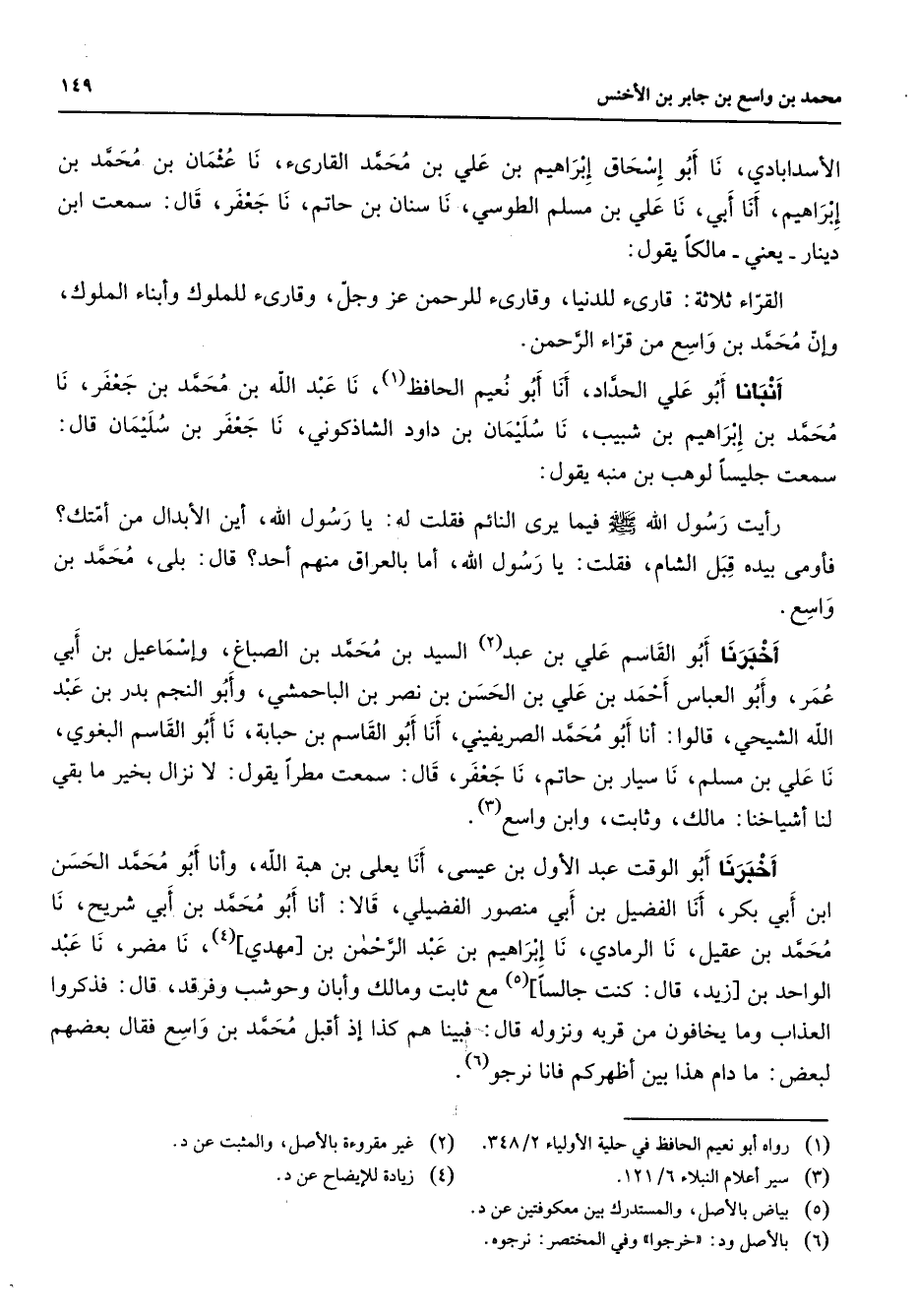 الأسد آبادي نا أبو إسحاق إبراهيم بن علي بن محمد القارئ نا عثمان بن محمد بن إبراهيم أنا أبي نا علي بن مسلم الطوسي نا سنان بن حاتم نا جعفر قال سمعت ابن دينار يعني مالكا يقول القراء ثلاثة قارئ للدنيا وقارئ للرحمن عز وجل وقارئ للملوك وأبناء الملوك وإن محمد بن واسع من قراء الرحمن أنبأنا أبو علي الحداد أنا أبو نعيم الحافظ (1) نا عبد الله بن محمد بن جعفر نا محمد بن إبراهيم بن شبيب نا سليمان بن داود الشاذكوني نا جعفر بن سليمان قال سمعت جليسا لوهب بن منبه يقول رأيت رسول الله (صلى الله عليه وسلم) فيما يرى النائم فقلت له يا رسول الله أين الأبدال من أمتك فأومى بيده قبل الشام فقلت يا رسول الله أما بالعراق منهم أحد قال بلى محمد بن واسع أخبرنا أبو القاسم علي بن عبد (2) السيد بن محمد بن الصباغ وإسماعيل بن أبي عمر وأبو العباس أحمد بن علي بن الحسن بن نصر بن الباحمشي وأبو النجم بدر بن عبد الله الشيحي قالوا أنا أبو محمد الصريفيني أنا أبو القاسم بن حبابة نا أبو القاسم البغوي نا علي بن مسلم نا سيار بن حاتم نا جعفر قال سمعت مطرا يقول لا نزال بخير ما بقي لنا أشياخنا مالك وثابت وابن واسع (3) أخبرنا أبو الوقت عبد الأول بن عيسى أنا يعلى بن هبة الله وأنا أبو محمد الحسن ابن أبي بكر أنا الفضيل بن أبي منصور الفضيل قالا أنا أبو محمد بن أبي شريح نا محمد بن عقيل نا الرمادي نا إبراهيم بن عبد الرحمن بن مهدي (4) نا مضر نا عبد الواحد بن زيد قال كنت جالسا (5) مع ثابت ومالك وأبان وحوشب وفرقد قال فذكروا العذاب وما يخافون من قربه ونزوله قال فبينا هم كذا إذ أقبل محمد بن واسع فقال بعضهم لبعض ما دام هذا بين أظهركم فانا نرجو (6)
