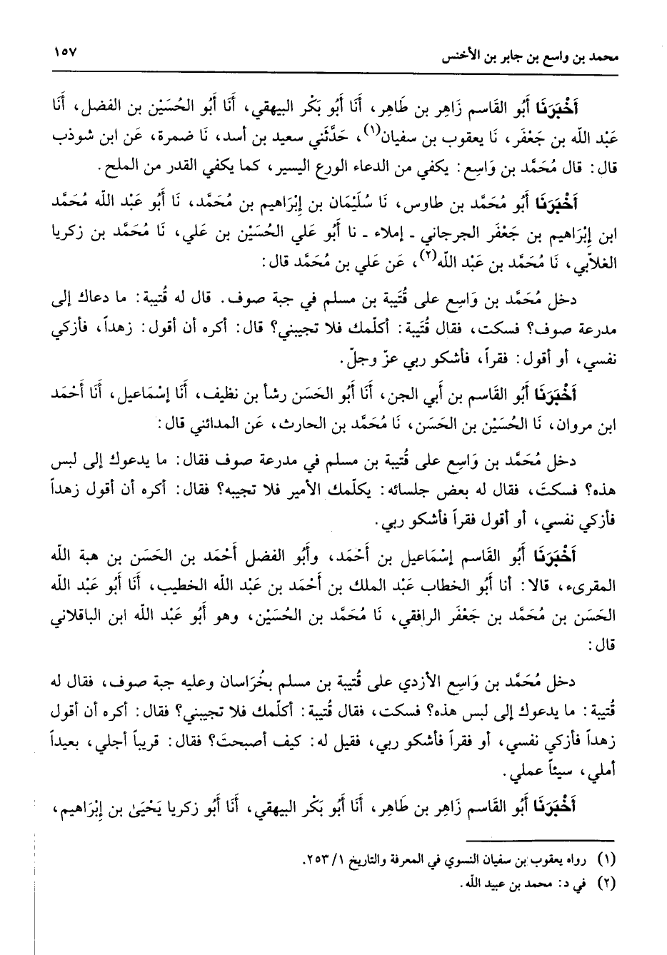أخبرنا أبو القاسم زاهر بن طاهر أنا أبو بكر البيهقي أنا أبو الحسين بن الفضل أنا عبد الله بن جعفر نا يعقوب بن سفيان (1) حدثني سعيد بن أسدنا ضمرة عن ابن شوذب قال قال محمد بن واسع يكفي من الدعاء الورع اليسير كمايكفي القدر من الملح أخبرنا أبو محمد بن طاووس نا سليمان بن إبراهيم بن محمد نا أبو عبد الله محمد ابن إبراهيم بن جعفر الجرجاني إملاء نا أبو علي الحسين بن علي نا محمد بن زكريا الغلابي نا محمد بن عبد الله (2) عن علي بن محمد قال دخل محمد بن واسع على قتيبة بن مسلم في جبة صوف قال له قتيبة ما دعاك إلى مدرعة صوف فسكت فقال قتيبة أكلمك فلا تجيبني قال أكره أنا أقول زهدا فأزكي نفسي أو أقول فقرا فأشكو ربي عز وجل أخبرنا أبو القاسم بن أبي الجن أنا أبو الحسن رشأ بن نظيف أنا إسماعيل أنا أحمد ابن مروان نا الحسين بن الحسن نا محمد بن الحارث عن المدائني قال دخل محمد بن واسع على قتيبة بن مسلم في مدرعة صوف فقال ما يدعوك إلى لبس هذه فسكت فقال له بعض جلسائه يكلمك الأمير فلا تجيبه فقال أكره أنا أقول زهدا فأزكي نفسي أو أقول فقرا فأشكو ربي أخبرنا أبو القاسم إسماعيل بن أحمد وأبو الفضل أحمد بن الحسن بن هبة الله المقرئ قالا أنا أبو الخطاب عبد الملك بن أحمد بن عبد الله الخطيب أنا أبو عبد الله الحسن بن محمد بن جعفر الرافقي نا محمد بن الحسين وهو أبو عبد الله ابن الباقلاني قال دخل محمد بن واسع الأزدي على قتيبة بن مسلم بخراسان وعليه جبة صوف فقال له قتيبة ما يدعوك إللبس هذه فسكت فقال قتيبة أكلمك فلا تجيبني فقال أكره أنا أقول زهدا فأزكي نفسي أو فقرا فأشكو ربي فقيل له كيف أصبحت فقال قريبا أجلي بعيدا أملي سيئا عملي أخبرنا أبو القاسم زاهر بن طاهر أنا أبو بكر البيهقي أنا أبو زكريا يحيى بن إبراهيم