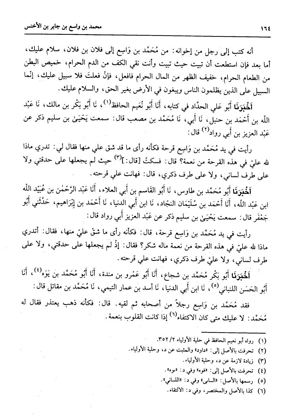 أنه كتب إلى رجل من إخوانه من محمد بن واسع إلى فلان بن فلان سلام عليك أما بعد فإن استطعت أنا تبيت حيث تبيت وأنت نقي الكف من الدم الحرام خميص البطن من الطعام الحرام خفيف الظهر من المال الحرام فافعل فإن فعلت فلا سبيل عليك إنما السبيل على الذين يظلمو الناس ويبغون في الأرض بغير الحق والسلام عليك أخبرنا أبو علي الحداد في كتابه أنا أبو نعيم الحافظ (1) نا أبو بكر بن مالك نا عبد الله بن أحمد بن حنبل نا أبي نا محمد بن مصعب قال سمعت يحيى بن سليم ذكر عن عبد العزيز بن أبي رواد (2) قال رأيت في يد محمد بن واسع قرحة فكأنه رأى ما قد شق علي منها فقال لي تدري ماذا لله علي في هذه القرحة من نعمة قال فسكت قال (3) حيث لم يجعلها على حدقتي ولا على طرف لساني ولا على طرف ذكري قال فهانت علي قرحته أخبرنا أبو محمد بن طاووس نا أبو القاسم بن أبي العلاء أنا عبد الرحمن بن عبيد الله ابن عبد الله أنا أحمد بن سليمان النجاد نا ابن أبي الدنيا نا أحمد بن إبراهيم حدثني أبو جعفر قال سمعت يحيى بن سليم ذكر عن عبد العزيز أبي رواد قال رأيت في يد محمد بن واسقرحة قال فكأنه رأى ما شق علي منها فقال أتدري ماذا لله علي في هذه القرحة من نعمة ماله شكر فقال إذ لم يجعلها على حدقتي ولا على طرف لساني ولا على طرف ذكري فهانت علي قرحته أخبرنا أبو بكر محمد بن شجاع أنا أبو عمرو بن مندة أنا أبو محمد بن يوة (4) أنا أبو الحسن اللنباني (5) نا ابن أبي الدنيا نا أسد بن عمار التيمي نا محمد بن مقاتل قال فقد محمد بن واسع رجلا من أصحابه ثم لقيه قال فكأنه ذهب يعتذر فقال له محمد لا عليك متى كان الاكتفاء (6) إذا كانت القلوب بنعمة
