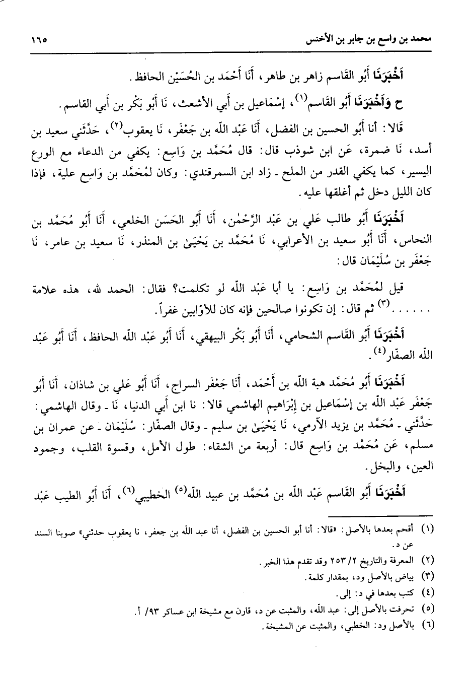 أخبرنا أبو القاسم زاهر بن طاهر أنا أحمد بن الحسين الحافظ وأخبرنا أبو القاسم (1) إسماعيل بن أبي الأشعث نا أبو بكر بن أبي القاسم قالا أنا أبو الحسين بن الفضل أنا عبد الله بن جعفر نا يعقوب حدثني سعيد بن أسد نا ضمرة عن ابن شوذب قال قال محمد بن واسع يكفي من الدعاء مع الورع اليسير كما يكفي القدر من الملح زاد ابن السمرقندي وكان لمحمد بن واسع علية فإذا كان الليل دخل ثم أغلقها عليه أخبرنا أبو طالب علي بن عبد الرحمن أنا أبو الحسن الخلعي أنا أبو محمد بن النحاس أنا أبو سعيد بن الأعرابي نا محمد بن يحيى بن المنذر نا سعيد بن عامرنا جعفر بن سليمان قال قيل لمحمد بن واسع يا أبا عبد الله لو تكلمت فقال الحمد لله هذه علامة (3) ثم قال إن تكونوا صالحين فإنه كان للأوابين غفرا أخبرنا أبو القاسم الشحامي أنا أبو بكر البيهقي أنا أبو عبد الحافظ أنا أبو عبد الله الصفار (4) أخبرنا أبو محمد هبة الله بن أحمد أنا جعفر السراج أنا أبو علي بن شاذان أنا أبو جعفر عبد الله بن إسماعيل بن إبراهيم الهاشمي قالا نا ابن ابي الدنيا نا وقال الهاشمي حدثني محمد بن يزيد الآرمي نا يحيى بن سليم وقال الصفار سليمان عن عمران بن مسلم عن محمد بن واسع قال أربعة من الشقاء طول الأمل وقسوة القلب وجمود العين والبخل أخبرنا أبو القاسم عبد الله بن محمد بن عبيد الله (5) الخطيبي (6) أنا أبو الطيب عبد