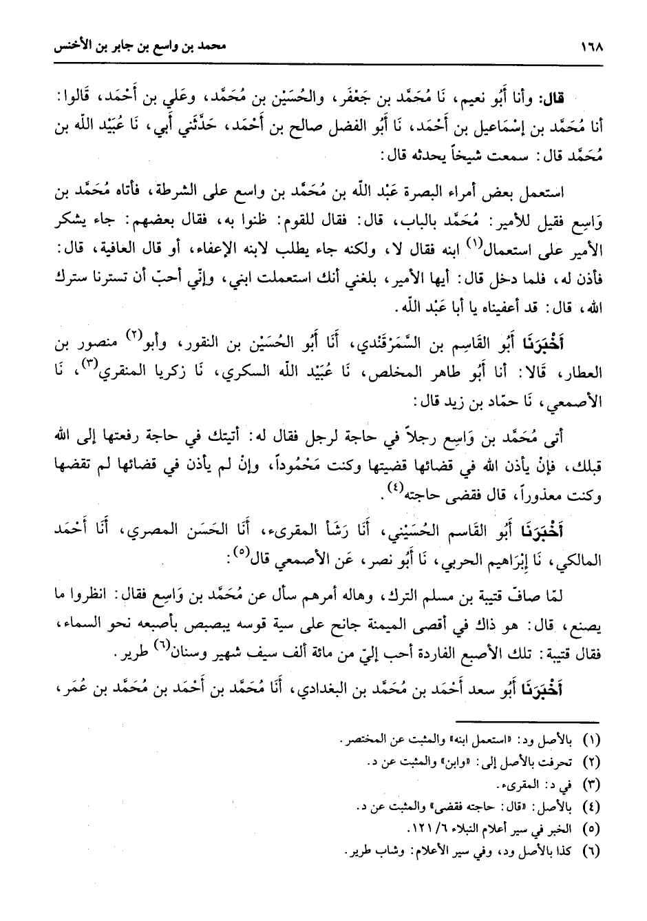 قال وأنا أبو نعيم نا محمد بن جعفر والحسين بن محمد وعلي بن أحمد قالوا أنا محمد بن إسماعيل بن أحمد نا أبو الفضل صالح بن أحمد حدثني ابي نا عبيد الله بن محمد قال سمعت شيخا يحدثه قال استعمل بعض أمراء البصرة عبد الله بن محمد بن واسع على الشرطة فأتاه محمد بن واسع فقيل للأمير محمد بالباب قال فقال للقوم ظنوا به فقال بعضهم جاء يشكر الأمير على استعمال (1) ابنه فقال لا ولكنه جاء يطلب لابنه الإعفاء أو قال العافية قال فأذن له فلما دخل قال أيها الأمير بلغني أنك استعملت ابني وإني أحب أن تسترنا سترك الله قال قد أعفيناه يا ابا عبد الله أخبرنا أبو القاسم بن السمرقندي أنا أبو الحسين بن النقور وابو منصور بن العطار قالا أنا أبو طاهر المخلص نا عبيد الله السكري نا زكريا المنقري نا الأصمعي نا حماد بن زيد قال أتى محمد بن واسع رجلا في حاجة لرجل فقال له أتيتك في حاجة رفعتها إلى الله قبلك فإن يأذن الله في قضائها قضيتها وكنت محمودا وإن لن يأذن في قضائها لم تقضها وكنت معذورا قال فقضى حاجته (4) أخبرنا أبو القاسم الحسيني أنا رشأ المقرئ أنا الحسن المصري أنا أحمد المالكي نا إبراهيم الحربي نا أبو نصر عن الأصمعي قال (5) لما صاف قتيبة بن مسلم الترك وهاله أمرهم سأل عن محمد بن واسع فقال انظروا ما يصنع قال هو ذاك في أقصى الميمنة جانح على سية قوسه يبصبص بأصبعه نحو السماء فقال قتيبة تلك الأصبع الفاردة أحب إلي من مائة ألف سيف شهير وسنان (6) طرير أخبرنا أبو سعد أحمد بن محمد بن البغدادي أنا محمد بن أحمد بن محمد بن عمر