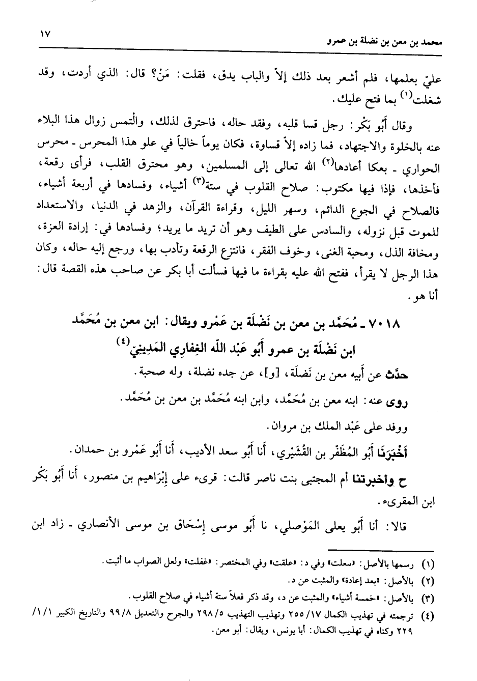 علي بعلمها فلم أشعر بعد ذلك إلا والباب يدق فقلت من قال الذي أردت وقد شغلت (1) بما فتح عليك وقال أبو بكر رجل قسا قلبه وفقد حاله فاحترق لذلك والتمس زوال هذا البلاء عنه بالخلوة والاجتهاد فما زاده إلا قساوة فكان يوما خاليا في علو هذا المحرس محرس الحواري بعكا أعادها (2) الله تعالى إلى المسلمين وهو محترق القلب فرأى رقعة فأخذها فإذا فيها مكتوب صلاح القلوب في ستة (3) أشياء وفسادها في أربعة أشياء فالصلاح في الجوع الدائم وسهر الليل وقراءة القرآن والزهد في الدنيا والاستعداد للموت قبل نزوله والسادس على الطيف وهو أن تريد ما يريد وفسادها في إرادة العزة ومخافة الذل ومحبة الغنى وخوف الفقر فانتزع الرقعة وتأدب بها ورجع إليه حاله وكان هذا الرجل لا يقرأ ففتح الله عليه بقراءة ما فيها فسألت أبا بكر عن صاحب هذه القصة قال أنا هو 7018 - محمد بن معن بن نضلة بن عمرو ويقال ابن معن بن محمد ابن نضلة بن عمرو أبو عبد الله الغفاري المديني (4) حدث عن أبيه معن بن نضلة وعن جده نضلة وله صحبة روى عنه ابنه معن بن محمد وابن ابنه محمد بن معن بن محمد ووفد على عبد الملك بن مروان أخبرنا أبو المظفر بن القشيري أنا أبو سعد الأديب أنا أبو عمر وبن حمدان وأخبرتنا أم المجتبى بنت ناصر قالت قرئ على إبراهيم بن منصور أنا أبو بكر ابن المقرئ قالا أنا أبو يعلى الموصلي نا أبو موسى إسحاق بن موسى الأنصاري زاد ابن