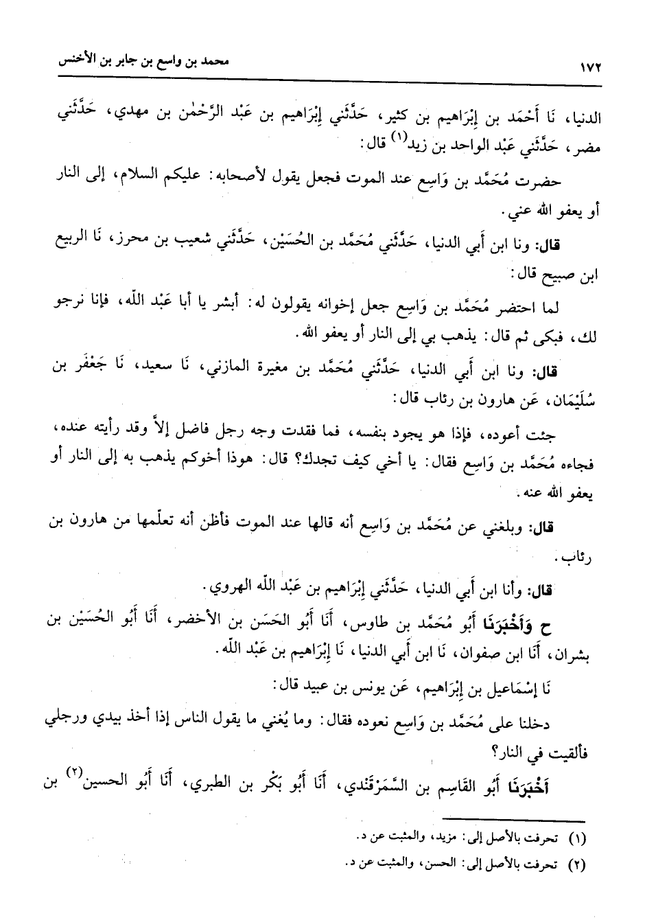 الدنيا نا أحمد بن إبراهيم بن كثير حدثني إبراهيم بن عبد الرحمن بن مهدي حدثني مضر حدثني عبد الواحد بن زيد (1) قال حضرت محمد بن واسع عند الموت فجعل يقول لأصحابه عليكم السلام إلى النار أو يعفو الله عني قال ونا ابن ابي الدنيا حدثني محمد بن الحسين حدثني شعيب بن محرز نا الربيع ابن صبيح قال لما احتضر محمد بن واسع جعل إخوانه يقولون له أبشر يا أبا عبد الله فإنا نرجو لك فبكى ثم قال يذهب بي إلى النار أو يعفو الله قال ونا ابن أبي الدنيا حدثني محمد بن مغيرة المازني نا سعيد نا جعفر بن سليمان عن هارون بن رئاب قال جئت أعوده فإذا هو يجود بنفسه فما فقدت وجه رجل فاضل إلا وقد رأيته عنده فجاءه محمد بن واسع فقال يا أخي كيف تجدك قال هو ذا أخوكم يذهب به إلى النار أو يعفو الله عنه قال وبلغني عن محمد بن واسع أنه قالها عند الموت فأظن أنه تعلمها من هارون بن رئاب قال وأنا ابن أبي الدنيا حدثني إبراهيم بن عبد الله الهروي وأخبرنا أبو محمد بن طاووس أنا أبو الحسن بن الأخضر أنا أبو الحسين بن بشران أنا ابن صفوان نا ابن أبي الدنيا نا إبراهيم بن عبد الله نا إسماعيل بن إبراهيم عن يونس بن عبيد قال دخلنا على محمد بن واسع نعوده فقال وما يغني ما يقول الناس إذا أخذ بيدي ورجلي فألقيت في النار أخبرنا أبو القاسم بن السمرقندي أنا أبو بكر بن الطبري أنا أبو الحسين (2) بن