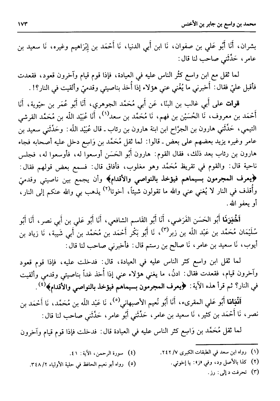 بشران أنا أبو علي بن صفوان نا ابن أبي الدنيا نا أحمد بن إبراهيم وغيره نا سعيد بن عامر حدثني صاحب لنا قال لما ثقل مع ابن واسع كثر الناس عليه في العياد فإذا قوم قيام وآخرون قعود فقعدت فأقبل علي فقال أخبرني ما يغني عني هؤلاء إذا أخذ بناصيتي وقدمي وألقيت في النار قرأت على أبي غالب بن البنا عن أبي محمد الجوهري أنا أبو عمر بن حيوية أنا أحمد بن معروف نا الحسين بن فهم نا محمد بن سعد أنا عبيد الله بن محمد القرشي التيمي حدثني هارون بن الجراح ابن ابنة هارون بن رئاب قال عبيد الله وحدثني سعيد بن عامر وغيره يزيد بعضهم على بعض قالوا لما ثقل محمد بن واسع دخل عليه أصحابه فجاء هارون بن رئاب بعد ذلك فقال القوم هارون أبو الحسن فأوسعوا له فأسعوا له فجلس ناحية قال والقوم في تقريظ محمد وهو مغلوب فأفاق قال فسمع بعض قولهم فقال " يعرف المجرمون بسيماهم فيؤخذ بالنواصي والأقدام " وأن يجمع بين ناصيتي وقدمي وأقذف في النار لا يغني عني والله ما تقولون شيئا أخوتا (2) يذهب بي والله عنكم إلى النار أو يعفو الله أخبرنا أبو الحسن الفرضي أنا أبو القاسم الشافعي أنا أبو علي بن أبي نصر أنا أبو سليمان محمد بن عبد الله بن زبر (3) نا أبو بكر أحمد بن محمد بن أبي شيبة نا زياد بن أيوب نا سعيد بن عامر نا صالح بن رستم قال فأخبرني صاحب لنا قال لما ثقل ابن واسع كثر الناس في العيادة قال فدخلت عليه فإذا قوم قعود وآخرون قيام فقعدت فقال ادن ما يغني هؤلاء عني إذا أخذ غدا بناصيتي وقدمي وألقيت في النار ثم قرأ هذه الآية " يعرف المجرمون بسيماهم فيؤخذ بالنواصي والأقدام " (4) أنبأنا أبو علي المقرئ أنا أبو نعيم الأصبهاني (5) نا عبد الله بن محمد نا أحمد بن نصر نا أحمد بن كثير نا سعيد بن عامر حدثني أبو عامر حدثني صاحب لنا قال لما ثقل محمد بن واسع كثر الناس عليه في العيادة قال فدخلت فإذا قوم قيام وآخرون
