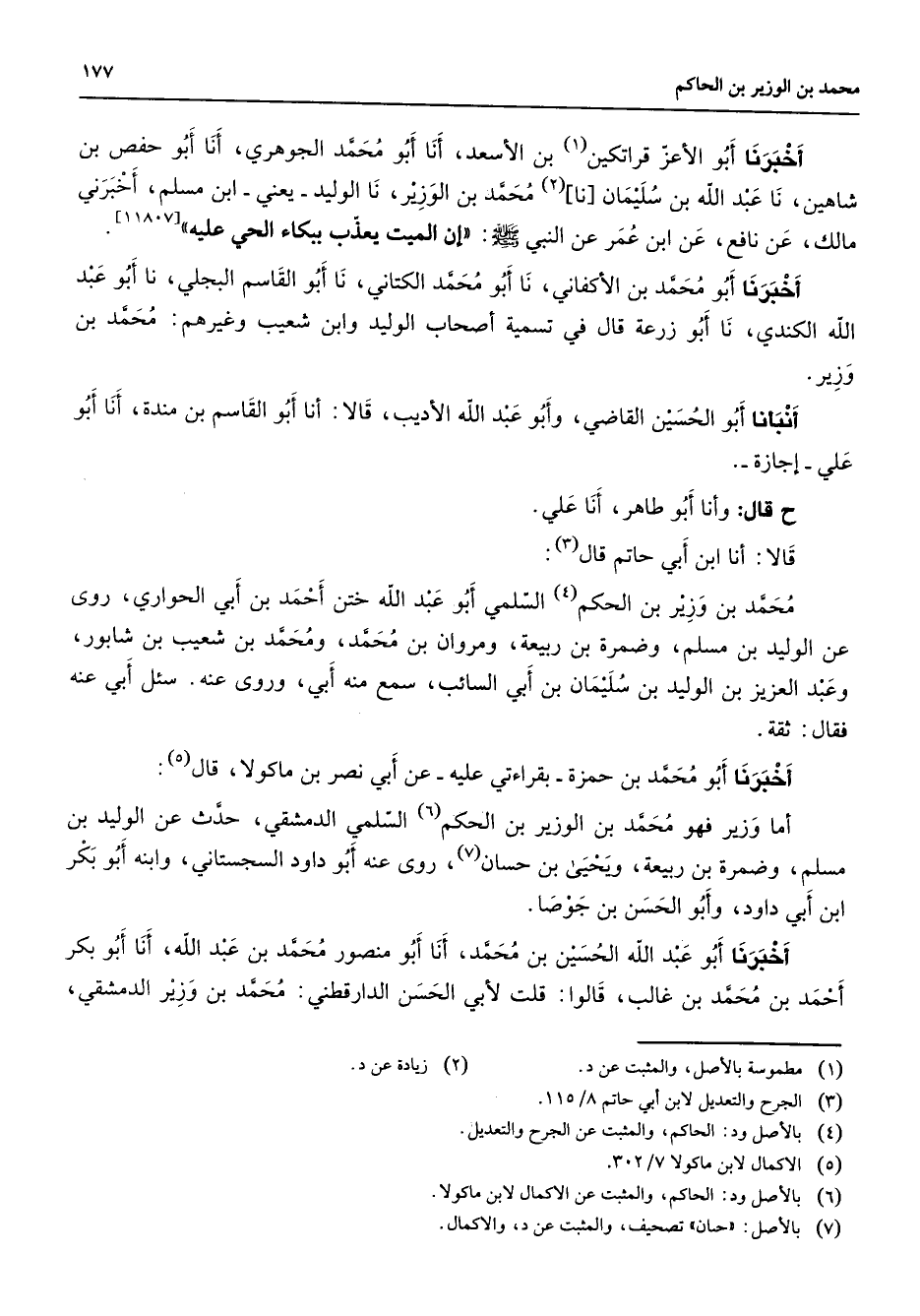 أخبرنا أبو الأعز قراتكين (1) بن الأسعد أنا أبو محمد الجوهري أنا أبو حفص بن شاهين نا عبد الله بن سليمان نا (2) محمد بن الوزير نا الوليد يعني ابن مسلم أخبرني مالك عن نافع عن ابن عمر عن النبي (صلى الله عليه وسلم) إن الميت يعذب ببكاء الحي عليه أخبرنا أبو محمد بن الأكفاني نا أبو محمد الكتاني نا أبو القاسم البجلي نا أبو عبد الله الكندي نا أبو زرعة قال في تسمية أصحاب الوليد وابن شعيب وغيرهم محمد بن وزير أنبأنا أبو الحسين القاضي وأبو عبد الله الأديب قالا أنا أبو القاسم بن مندة أنا أبو علي إجازة قال وأنا أبو طاهر أنا علي قالا أنا ابن أبي حاتم قال (3) محمد بن وزير بن الحكم (4) السلمي أبو عبد الله ختن أحمد بن أبي الحواري روى عن الوليد بن مسلم وضمرة بن ربيعة ومروان بن محمد ومحمد بن شعيب بن شابور وعبد العزيز بن الوليد بن سليمان بن أبي السائب سمع منه أبي وروى عنه سئل أبي عنه فقال ثقة أخبرنا أبو محمد بن حمزة بقراءتي عليه عن أبي نصر بن ماكولا قال (5) أما وزير فهو محمد بن الوزير بن الحكم (6) السلمي الدمشقي حدث عن الوليد بن مسلم وضمرة بن ربيعة ويحيى بن حسان (7) روى عنه أبو داود السجستاني وابنه أبو بكر ابن أبي داود وأبو الحسن بن جوصا أخبرنا أبو عبد الله الحسين بن محمد أنا أبو منصور محمد بن عبد الله أنا أبو بكر أحمد بن محمد بن غالب قالوا قلت لأبي الحسن الدارقطني محمد بن وزير الدمشقي