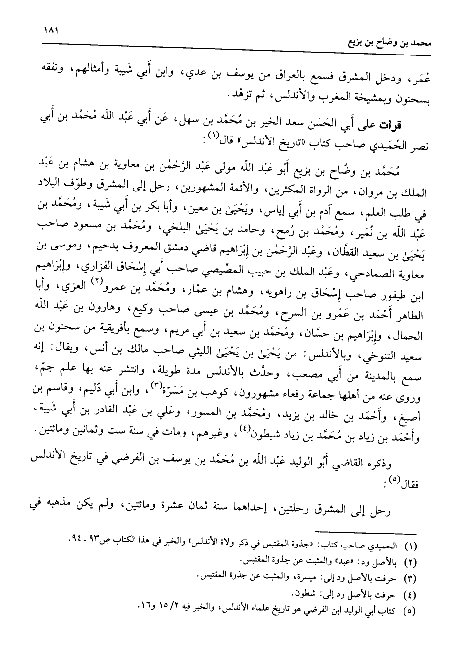 5 - () كتاب أبي الوليد ابن الفرضي هو تاريخ علماء الاندلس والخبر فيه 2 / 15 و 16
