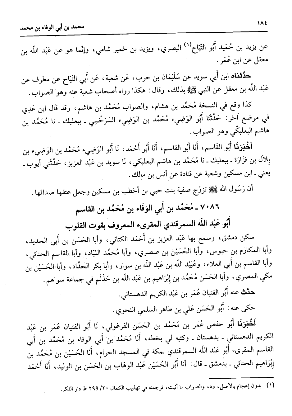 عن يزيد بن حميد أبو التياح (1) البصري ويزيد بن خمير شامي وإنما هو عن عبد الله بن معقل عن ابن عمر حدثناه ابن أبي سويد عن سليمان بن حرب عن شعبة عن أبي التياح عن مطرف عن عبد الله بن معقل عن النبي (صلى الله عليه وسلم) بذلك وقال هكذا رواه أصحاب شعبة عنه وهو الصواب كذا وقع في النسخة محمد بن هشام والصواب محمد بن هاشم وقد قال ابن عدي في موضع آخر حدثنا أبو الوضئ محمد بن الوضئ السرخسي ببعلبك نا محمد بن هاشم البعلبكي وهو الصواب أخبرنا أبو القاسم أنا أبو القاسم أنا أبو أحمد نا أبو الوضئ محمد بن الوضئ بن بلال بن فزارة ببعلبك نا محمد بن هاشم البعلبكي نا سويد بن عبد العزيز حدثني أيوب يعني ابن مسكين وشعبة عن قتادة عن أنس بن مالك أن رسول الله (صلى الله عليه وسلم) تزوج صفية بنت حيي بن أخطب بن مسكين وجعل عتقها صداقها 7086 - محمد بن أبي الوفاء بن محمد بن القاسم أبو عبد الله السمرقندي المقرئ المعروف بقوت القلوب سكن دمشق وسمع بها عبد العزيز بن أحمد الكتاني وأبا الحسن بن أبي الحديد وأبا المكارم بن حبوس وأبا الحسين بن صصري وأبا محمد اللباد وأبا القاسم الحنائي وأبا القاسم بن أبي العلاء وعبيد الله بن عبد الله بن سوار وأبا بكر الحداد وأبا الحسين بن مكي المصري وأبا الحسن محمد بن إبراهيم بن عبد الله بن حذلم في جماعة سواهم حدث عنه أبو الفتيان عمر بن عبد الكريم الدهستاني حكى عنه أبو الحسن علي بن طاهر السلمي النحوي أخبرنا أبو حفص عمر بن محمد بن الحسن الفرغولي نا أبو الفتيان عمر بن عبد الكريم الدهستاني بدهستان وكتبه لي بخطه أنا محمد بن أبي الوفاء بن محمد بن أبي القاسم المقرئ أبو عبد الله السمرقندي بمكة في المسجد الحرام أنا الحسين بن محمد بن إبراهيم الحنائي بدمشق قال أنا أبو الحسين عبد الوهاب بن الحسن بن الوليد أنا أحمد