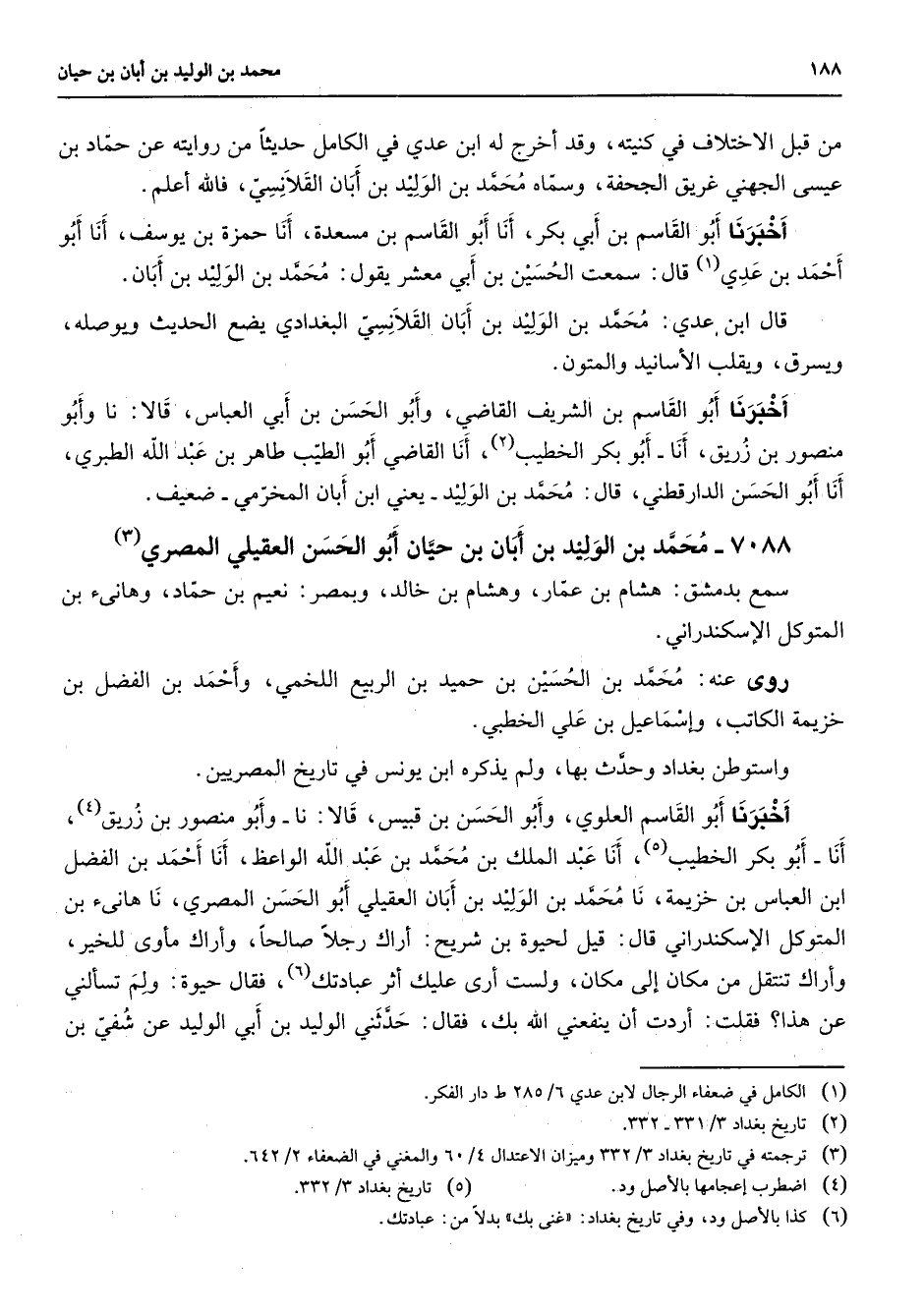 من قبل الاختلاف في كنيته وقد أخرج له ابن عدي في الكامل حديثا من روايته عن حماد بن عيسى الجهني غريق الجحفة وسماه محمد بن الوليد بن أبان القلانسي فالله أعلم أخبرنا أبو القاسم بن أبي بكر أنا أبو القاسم بن مسعدة أنا حمزة بن يوسف أنا أبو أحمد بن عدي (1) قال سمعت الحسين بن أبي معشر يقول محمد بن الوليد بن أبان قال ابن عدي محمد بن الوليد بن ابان القلانسي البغدادي يضع الحديث ويوصله ويسرق ويقلب الأسانيد والمتون أخبرنا أبو القاسم بن الشريف القاضي وأبو الحسن بن أبي العباس قالا نا وأبو منصور بن زريق أنا أبو بكر الخطيب (2) أنا القاضي أبو الطيب طاهر بن عبد الله الطبري أنا أبو الحسن الدارقطني قال محمد بن الوليد يعني ابن أبان المخرمي ضعيف 7088 - محمد بن الوليد بن أبان بن حيان أبو الحسن العقيلي المصري (3) سمع بدمشق هشام بن عمار وهشام بن خالد وبمصر نعيم بن حماد وهانئ بن المتوكل الأسكندراني روى عنه أحمد بن الحسين بن حميد بن الربيع اللخمي وأحمد بن الفضل بن خزيمة الكاتب وإسماعيل بن علي الخطبي واستوطن بغداد وحدث بها ولم يذكره ابن يونس في تاريخ المصريين أخبرنا أبو القاسم العلوي وابو الحسن بن قبيس قالا نا وابو منصور بن زريق (4) أنا أبو بكر الخطيب (5) أنا عبد الملك بن محمد بن عبد الله الواعظ أنا أحمد بن الفضل ابن العباس بن خزيمة نا محمد بن الوليد بن أبان العقيلي أبو الحسن المصري نا هانئ بن المتوكل الأسكندراني قال قيل لحيوة بن شريح اراك رجلا صالحا وأراك مأو للخير وأراك تنتقل من مكان إلى مكان ولست أرى عليك أثر عبادتك (6) فقال حيوة ولم تسألني عن هذا فقلت أردت أن ينفعني الله بك فقال حدثني الوليد بن أبي الوليد عن شفي بن