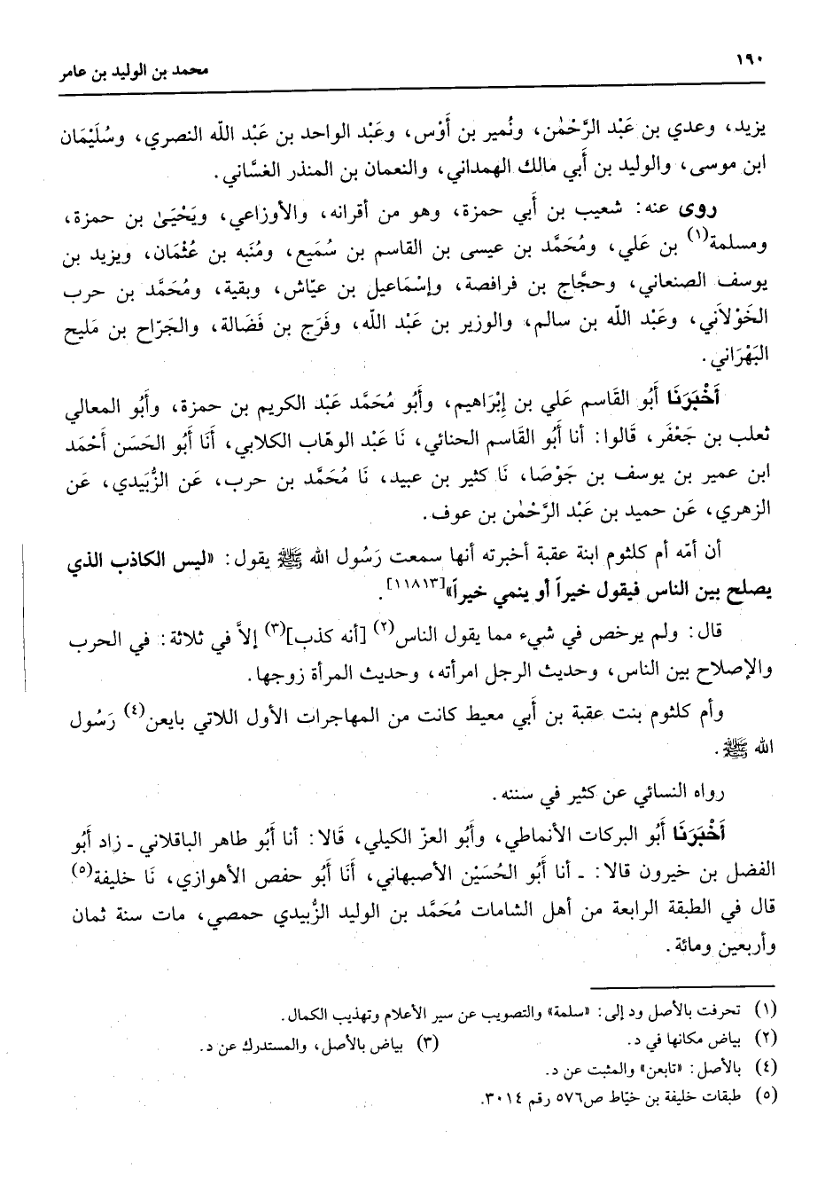 يزيد وعدي بن عبد الرحمن ونمير بن أوس وعبد الواحد بن عبد الله النصري وسليمان ابن موسى والوليد بن أبي مالك الهمداني والنعمان بن المنذر الغساني روى عنه شعيب بن أبي حمزة وهو من أقرانه والأوزاعي ويحيى بن حمزة ومسلمة (1) ان علي ومحمد بن عيسى بن القاسم بن سميع ومنبه بن عثمان ويزيد بن يوسف الصنعاني وحجا بن فرافصة وإسماعيل بن عياش وبقية ومحمد بن حرب الخولاني وعبد الله بن سالم والوزير بن عبد الله وفرج بن فضالة والجراح بن مليح البهراني أخبرنا أبو القاسم علي بن إبراهيم وابو محمد عبد الكريم بن حمزة وأبو المعالي ثعلب بن جعفر قالوا أنا أبو القاسم الحنائي نا عبد الوهاب الكلابي أنا أبو الحسن أحمد ابن عمير بن يوسف بن جوصا نا كثير بن عبيد نا محمد بن حرب عن الزبيدي عن الزهري عن حميد بن عبد الرحمن بن عوف أن أمه أم كلثوم ابنة عقبة أخبرته أنها سمعت رسول الله (صلى الله عليه وسلم) يقول ليس الكاذب الذي يصلح بين الناس فيقول خيرا أو ينمي خيرا قال ولم يرخص في شئ مما يقول الناس (2) أنه كذب (3) إلا في ثلاثة في الحرب والإصلاح بين الناس وحديث الرجل امرأته وحديث المرأة زوجها وأم كلثوم بنت عقبة بن أبي معيط كانت من المهاجرات الأول اللاتي بايعن (4) رسول الله (صلى الله عليه وسلم) رواه النسائي عن كثير في سننه أخبرنا أبو البركات الأنماطي وأبو العز الكيلي قالا أنا أبو طاهر الباقلاني زاد أبو الفضل بن خيرون قالا أنا أبو الحسين الأصبهاني أنا أبو حفص الأهوازي نا خليفة (5) قال في الطبقة الرابعة من أهل الشامات محمد بن الوليد الزبيدي حمصي مات سنة ثمان وأربعين ومائة