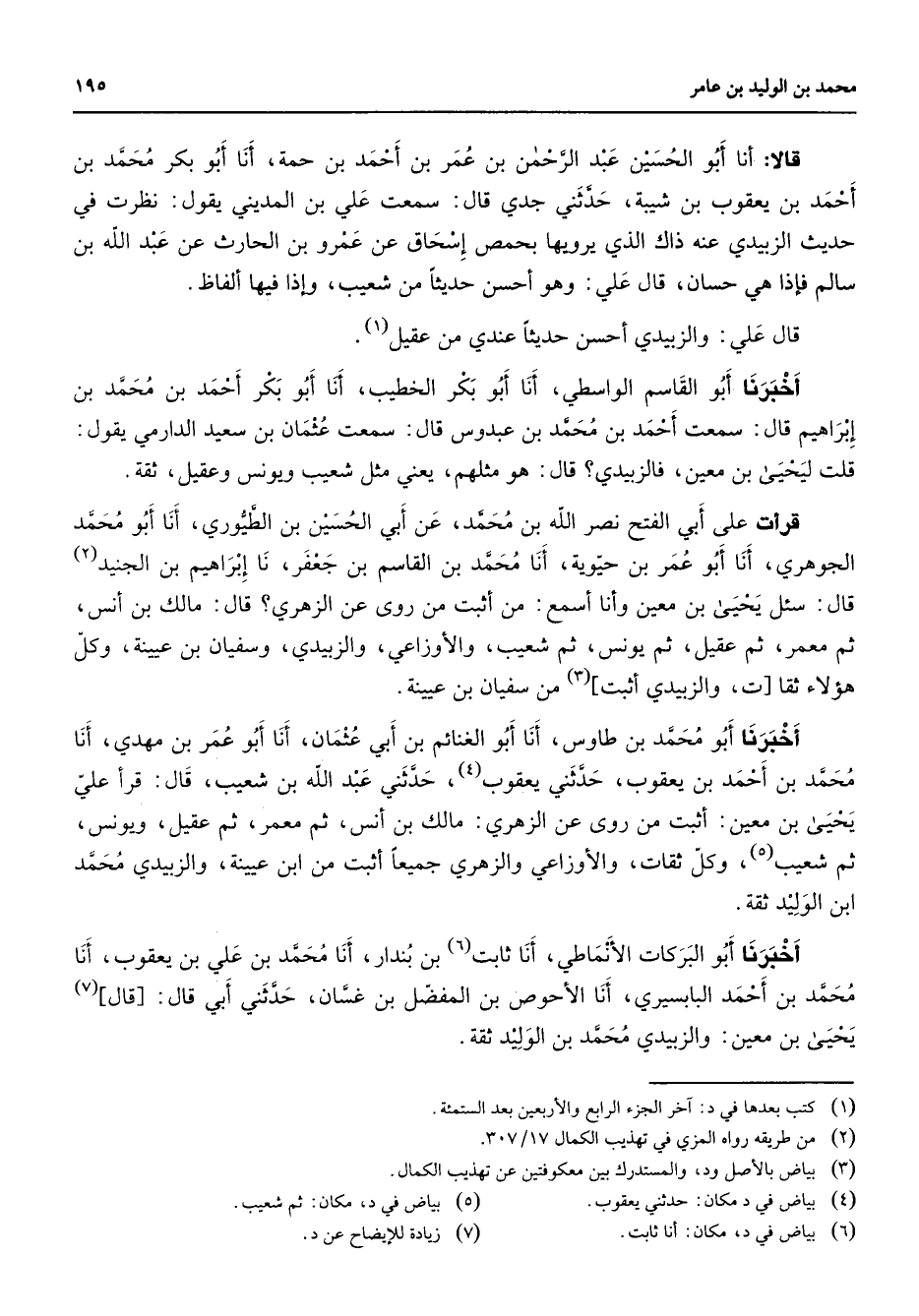 قالا أنا أبو الحسين عبد الرحمن بن عمر بن أحمد بن حمة أنا أبو بكر محمد بن أحمد بن يعقوب بن شيبة حدثني جدي قال سمعت علي ابن المديني يقول نظرت في حديث الزبيدي عنه ذاك الذي يرويها بحمص إسحاق عن عمرو بن الحارث عن عبد الله بن سالم فإذا هي حسان قال علي وهو أحسن حديثا من شعيب وإذا فيها ألفاظ قال علي والزبيدي أحسن حديثا عندي من عقيل (1) أخبرنا أبو القاسم الواسطي أنا أبو بكر الخطيب أنا أبو بكر احمد بن محمد بن إبراهيم قال سمعت أحمد بن محمد بن عبدوس قال سمعت عثمان بن سعيد الدارمي يقول قلت ليحيى بن معين فالزبيدي قال هو مثلهم يعني مثل شعيب ويونس وعقيل ثقة قرأت على أبي الفتح نصر الله بن محمد عن أبي الحسين بن الطيوري أنا أبو محمد الجوهري أنا أبو عمر بن حيوية أنا محمد بن القاسم بن جعفر نا إبراهيم بن الجنيد (2) قال سئل يحيى بن معين وأنا أسمع من أثبت من روى عن الزهري قال مالك بن أنس ثم معمر ثم عقيل ثم يونس ثم شعيب والأوزاعي والزبيدي وسفيان بن عيينة وكل هؤلاء ثقات والزبيدي أثبت (3) من سفيان بن عيينة أخبرنا أبو محمد بن طاووس أنا أبو الغنائم بن أبي عثمان أنا أبو عمر بن مهدي أنا محمد بن أحمد بن يعقوب (4) حدثني يعقوب حدثني عبد الله بن شعيب قال قرأ علي يحيى بن معين أثبت من روى عن الزهري مالك بن أنس ثم معمر ثم عقيل ويونس ثم شعيب (5) وكل ثقات والأوزاعي والزهري جميعا أثبت من ابن عيينة والزبيدي محمد ابن الوليد ثقة أخبرنا أبو البركات الأنماطي أنا ثابت (6) بن بندار أنا محمد بن علي بن يعقوب أنا محمد بن أحمد البابسيري أنا الأحوص بن المفضل بن غسان حدثني أبي قال قال (7) يحيى بن معين والزبيدي محمد بن الوليد ثقة