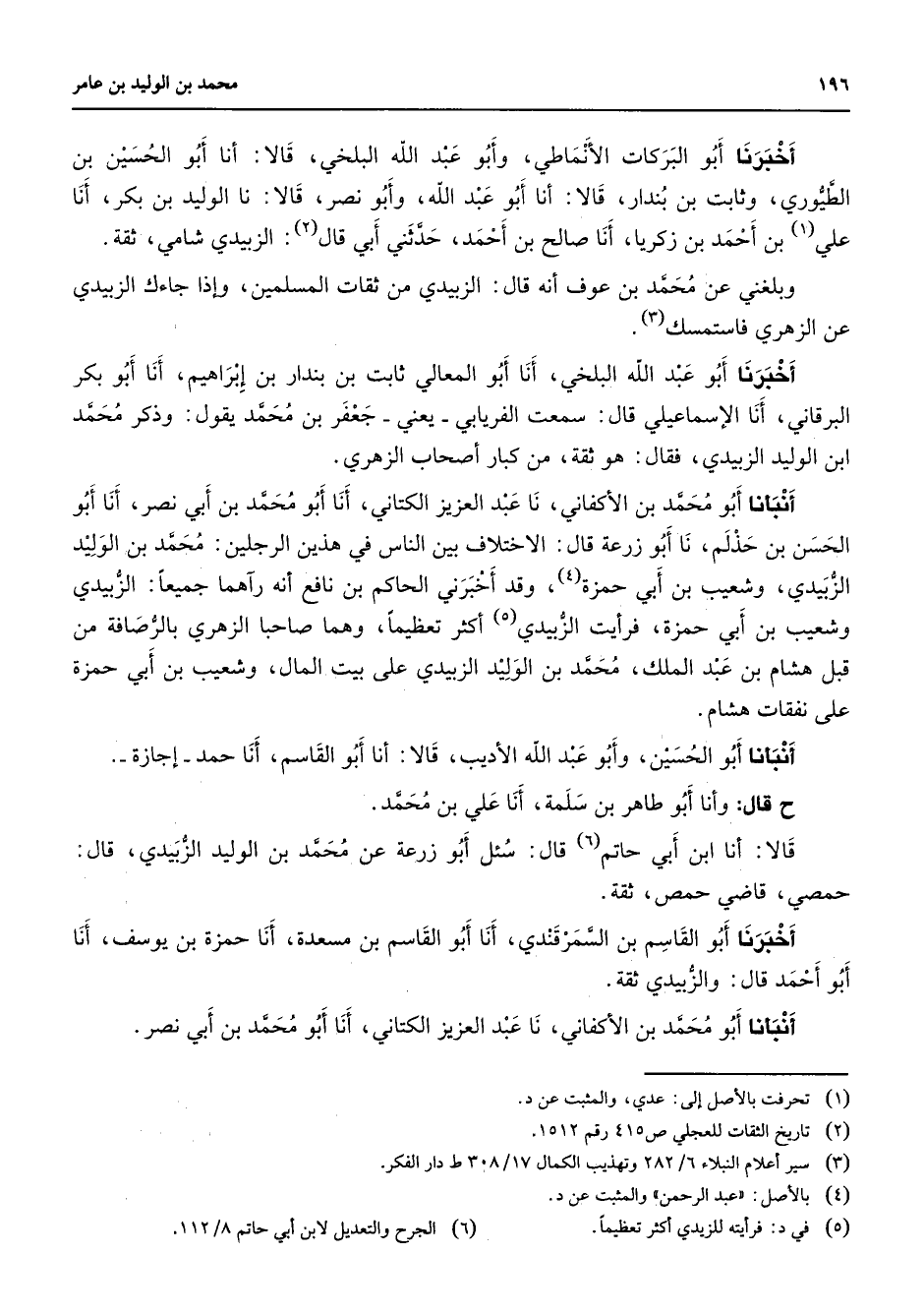 أخبرنا أبو البركات الأنماطي وأبو عبد الله البلخي قالا أنا أبو الحسين بن الطيوري وثابت بن بندار قالا أنا أبو عبد الله وأبو نصر قالا نا الوليد بن بكر أنا علي (1) بن أحمد بن زكريا أنا صالح بن أحمد حدثني أبي قال (2) الزبيدي شامي ثقة وبلغني عن محمد بن عوف أنه قال الزبيدي من ثقات المسلمين وإذا جاءك الزبيدي إ عن الزهري فاستمسك (3) أخبرنا أبو عبد الله البلخى أنا أبو المعالي ثابت بن بندار بن إبراهيم أنا أبو بكر البرقاني أنا الإسماعيلي قال سمعت الفريابي يعني جعفر بن محمد يقول وذكر محمد ابن الوليد الزبيدي فقال هو ثقة من كبار أصحاب الزهري أنبأنا أبو محمد بن الأكفاني نا عبد العزيز الكتاني أنا أبو محمد بن أبي نصر أنا أبو الحسن بن حذلم نا أبو زرعة قال الاختلاف بين الناس في هذين الرجلين محمد بن الوليد الزبيدي وشعيب بن أبي حمزة (4) وقد أخبرني الحاكم بن نافع أنه رآهما جميعا الزبيدي وشعيب بن أبي حمزة فرأيت الزبيدي (5) أكثر تعظيما وهما صاحبا الزهري بالرصافة من قبل هشام بن عبد الملك محمد بن الوليد الزبيدي على بيت المال وشعيب بن أبي حمزة على نفقات هشام أنبأنا أبو الحسين وأبو عبد الله الأديب قالا أنا أبو القاسم أنا حمد إجازة قال وأنا أبو طاهر بن سلمة أنا علي بن محمد قالا أنا ابن أبي حاتم (6) قال سئل أبو زرعة عن محمد بن الوليد الزبيدي قال حمصي قاضي حمص ثقة أخبرنا أبو القاسم بن السمرقندي أنا أبو القاسم بن مسعدة أنا حمزة بن يوسف أنا أبو أحمد قال والزبيدي ثقة أنبأنا أبو محمد بن الأكفاني نا عبد العزيز الكتاني أنا أبو محمد بن أبي نصر