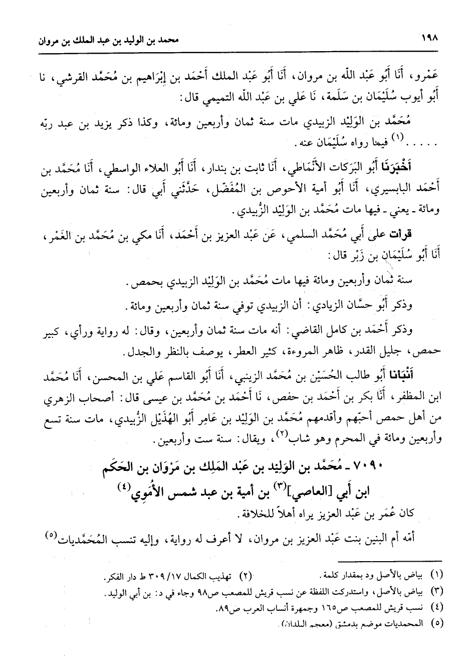 عمرو أنا أبو عبد الله بن مروان أنا أبو عبد الملك أحمد بن إبراهيم بن محمد القرشي نا أبو أيوب سليمان بن سلمة نا علي بن عبد الله التميمي قال محمد بن الوليد الزبيدي مات سنة ثمان وأربعين ومائة وكذا ذكر يزيد بن عبد ربه (1) فيما رواه سليمان عنه أخبرنا أبو البركات الأنماطي أنا ثابت بن بندارأنا أبو العلاء الواسطي أنا محمد بن أحمد البابسيري أنا أبو أمية الأحوص بن المفضل حدثني أبي قال سنة ثمان وأربعين ومائة يعني فيها مات محمد بن الوليد الزبيدي قرأت على أبي محمد السلمي عن عبد العزيز بن أحمد أنا مكي بن محمد بن الغمر أنا أبو سليمان بن زبر قال سنة ثمان وأربعين ومائة فيها مات محمد بن الوليد الزبيدي بحمص وذكر أبو حسان الزيادي أنا الزبيدي توفي سنة ثمان وأربعين ومائة وذكر أحمد بن كامل القاضي أنه مات سنة ثمان وأربعين وقال له رواية ورأي كبير حمص جليل القدر ظاهر المروءة كثير العطر يوصف بالنظر والجدل أنبأنا أبو طالب الحسين بن محمد الزينبي أنا أبو القاسم علي بن المحسن أنا محمد ابن المظفر أنا بكر بن أحمد بن حفص نا أحمد بن محمد بن عيسى قال أصحاب الزهري من أهل حمص أحبهم وأقدمهم محمد بن الوليد بن عامر أبو الهذيل الزبيدي مات سنة تسع وأربعين ومائة في المحرم وهو شاب (2) ويقال سنة ست وأربعين 7090 - محمد بن الوليد بن عبد الملك بن مروان بن الحكم ابن أبي العاصي (3) بن أمية بن عبد شمس الأموي (4) كان عمر بن عبد العزيز يراه أهلا للخلافة أمه أم البنين بنت عبد العزيز بن مروان لا أعرف له رواية وإليه تنسب المحمديات (5)