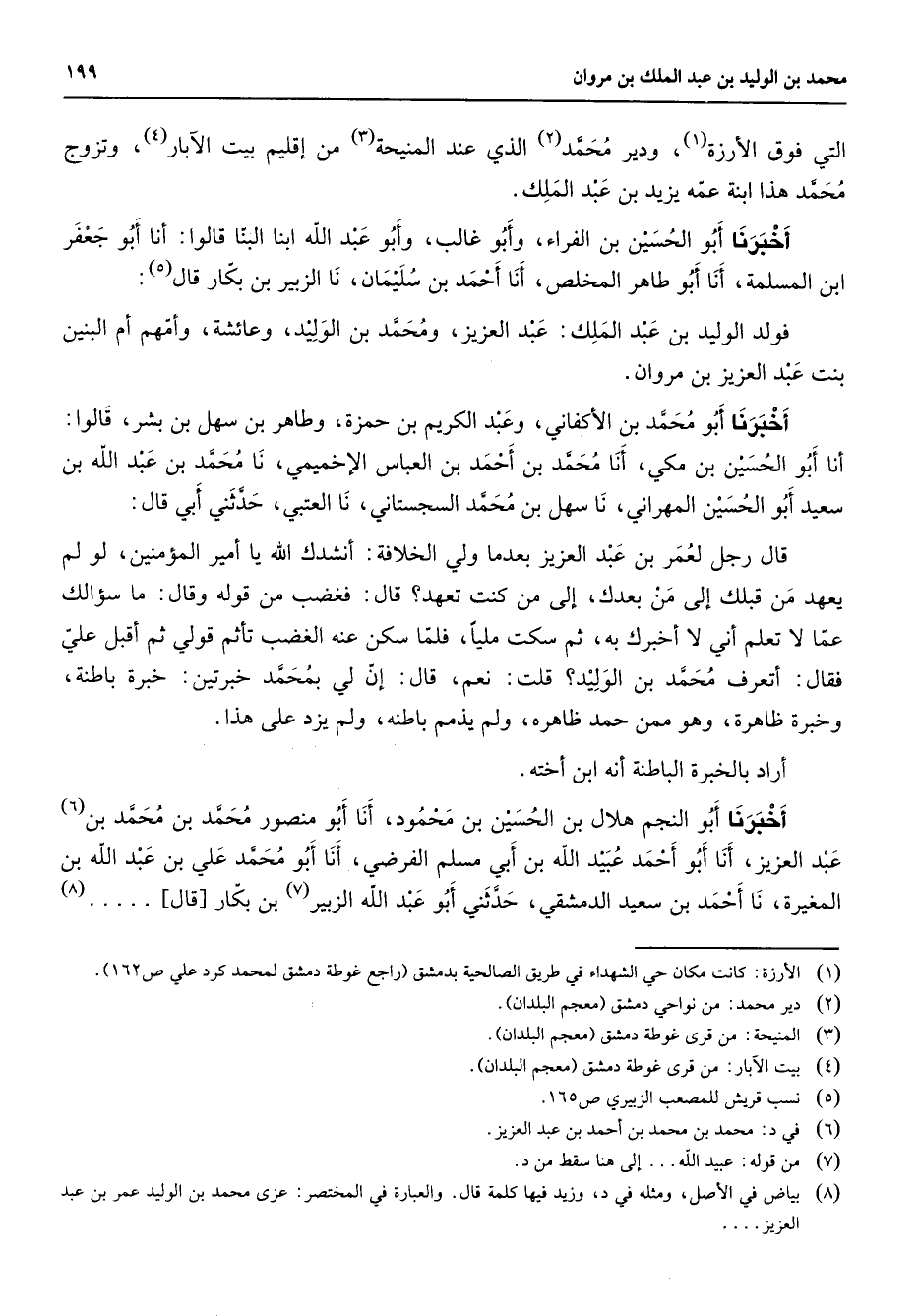 التي فوق الأرزة (1) ودير محمد (2) الذي عند المنيحة (3) من إقليم بيت الآبار (4) وتزوج محمد هذا ابنة عمه يزيد بن عبد الملك أخبرنا أبو الحسين بن الفراء وأبو غالب وأبو عبد الله ابنا البنا قالوا أنا أبو جعفر ابن المسلمة أنا أبو طاهر المخلص أنا أحمد بن سليمان نا الزبير بن بكار قال (5) فولد الوليد بن عبد الملك عبد العزيز ومحمد بن الوليد وعائشة وأمهم أم البنين بنت عبد العزيز بن مروان أخبرنا أبو محمد بن الأكفاني وعبد الكريم بن حمزة وطاهر بن سهل بن بشر قالوا أنا أبو الحسين بن مكي أنا محمد بن أحمد بن العباس الإخميمي نا محمد بن عبد الله بن سعيد أبو الحسين المهراني نا سهل بن محمد السجستاني نا العتبي حدثني أبي قال قال رجل لعمر بن عبد العزيز بعدما ولي الخلافة أنشدك الله يا أمير المؤمنين لو لم يعهد من قبلك إلى من بعدك إلى من كنت تعهد قال فغضب من قوله وقال ما سؤالك عما لا تعلم أني لا أخبرك به ثم سكت مليا فلما سكن عنه الغضب تأثم قولي ثم أقبل علي فقال أتعرف محمد بن الوليد قلت نعم قال إن لي بمحمد خبرتين خبرة باطنة وخبرة ظاهرة وهو ممن حمد ظاهره ولم يذمم باطنه ولم يزد على هذا أراد بالخبرة الباطنة أنه ابن أخت أخبرنا أبو النجم هلال بن الحسين بن محمود أنا أبو منصور محمد بن محمد بن (6) عبد العزيز أنا أبو أحمد عبيد الله بن أبي مسلم الفرضي أنا أبو محمد علي بن عبد الله بن المغيرة نا أحمد بن سعيد الدمشقي حدثني أبو عبد الله الزبير (7) بن بكار قال (8)