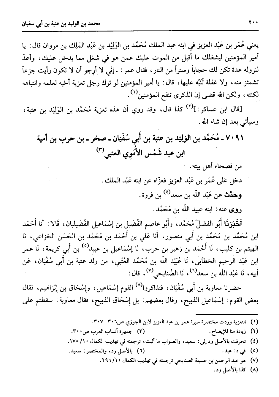 يعني عمر بن عبد العزيز في ابنه عبد الملك محمد بن الوليد بن عبد الملك بن مروان قال يا أمير المؤمنين ليشغلك ما أقبل من الموت عليك عمن هو في شغل مما يدخل عليك وأعد لنزوله عدة تكن لك حجابا وسترا من النار فقال عمر إني لأرجو أن لا تكون رأيت جزعا تشمئز منه ولا غفلة تنبه عليها قال يا أمير المؤمنين لو ترك رجل تعزية أخيه لعلمه وانتباهه لكنته ولكن الله قضى إن الذكرى تنفع المؤمنين (1) قال ابن عساكر (2) كذا قال وقد روي أنا هذه تعزية محمد بن الوليد بن عتبة وسيأتي بعد شاء الله 7091 - محمد بن الوليد بن عتبة بن أبي سفيان صخر بن حرب بن أمية ابن عبد شمس الأموي العتبي (3) من فصحاء أهل بيته دخل على عمر بن عبد العزيز فعزا عن ابنه عبد الملك وحدث عن عبد الله بن سعد (4) بن فروة روى عنه ابنه عبيد الله بن محمد أخبرنا أبو الفضل محمد وأبو عاصم الفضيل بن إسماعيل الفضيليان قالا أنا أحمد ابن محمد بن محمد بن أبي منصور أنا علي بن أحمد بن محمد بن الحسن الخزاعي نا الهيثم بن كليب نا أحمد بن زهير بن حرب نا إسماعيل بن عبيد بن أبي كريمة نا عمر ابن عبد الرحيم الخطابي نا عبيد الله بن محمد العتبي من ولد عتبة بن أبي سفيان عن أبيه نا عبد الله بن سعد (6) نا الصنابحي (7) قال حضرنا معاوية بن أبي سفيان فتذاكروا القوم إسماعيل وإسحاق بن إبراهيم فقال بعض القوم إسماعيل الذبيح وقال بعضهم بل إسحاق الذبيح فقال معاوية سقطتم على