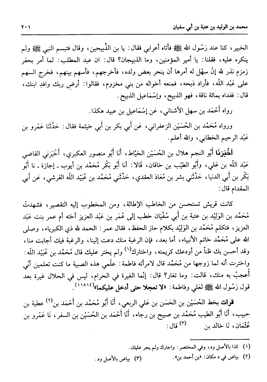 الخبير كنا عند رسول الله (صلى الله عليه وسلم) فأتاه أعرابي فقال يا ابن الذبيحين وقال فتبسم النبي (صلى الله عليه وسلم) ولم ينكره عليه فقلنا يا أمير المؤمنين وما الذبيحان قال إن عبد المطلب لما أمر بحفر زمزم نذر لله إن سهل له أمرها أن ينحر بعض ولده فأخرجهم فأسهم بينهم فخرج السهم على عبد الله فأراد ذبحه فمنعه أخواله من بني مخزوم فقالوا أرض ربك وافد ابنك قال ففداه بمائة ناقة فهو الذبيح وإسماعيل الذبيح رواه أحمد بن سهل الأشناني عن إسماعيل بن عبيد هكذا ورواه محمد بن الحسين الزعفراني عن أبي بكر بن أبي خيثمة فقال حدثنا عمرو بن عبد الرحيم الخطابي والله أعلم أخبرنا أبو النجم هلال بن الحسين الخياط أنا أبو منصور العكبري أخبرني القاضي عبد الله بن علي وأبو الطيب بن خاقان قالا أنا أبو بكر محمد بن أيوب إجازة نا أبو بكر بن أبي الدنيا حدثني بشر بن معاذ العقدي حدثني محمد بن عبيد الله القرشي عن أبي المقدام قال كانت قريش تستحسن من الخاطب الأطالة ومن المخطوب إليه التقصير فشهدت محمد بن الوليد بن عتبة بن أبي سفيان خطب إلى عمر بن عبد العزيز أخته أم عمر بنت عبد العزيز فتكلم محمد بن الوليد بكلام حاز الحفظ فقال عمر الحمد لله ذي الكبرياء وصلى الله على محمد خاتم الأنبياء أما بعد فإن الرغبة منك دعت إلينا والرغبة فيك أجابت منا وقد أحسن بك ظنا من اودعك كريمته واختارك (1) ولم يختر عليك قال محمد بن عبيد الله واخترت أنه لم ازوجها من محمد قال لامرأته فاطمة علمي هذه الصبية ما كنت تعلمين أني أعجب به منك قالت وما تغار قال إنما الغيرة في الحرام ليس في الحلال غيرة بعد قول رسول الله (صلى الله عليه وسلم) لعلي وفاطمة لا تعجلا حتى أدخل عليكما قرأت بخط الحسين بن الحسن بن علي الربعي أنا أبو محمد بن أحمد بن (2) عطية بن حبيب أنا أبو الطيب محمد بن صبيح بن رجاء أنا أحمد بن الحسين بن السفر نا عمرو بن عثمان نا خالد بن (3) قال