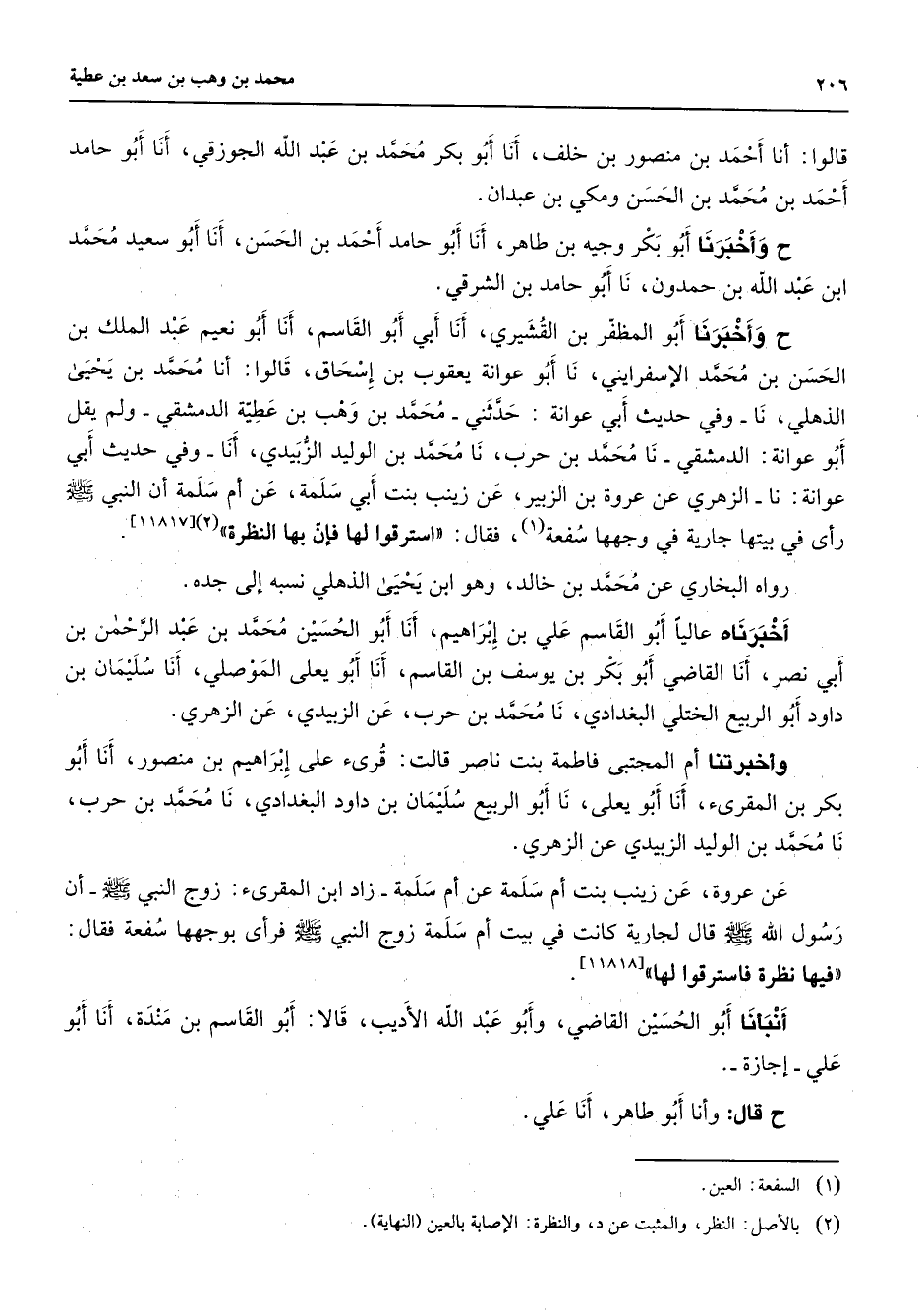 قالوا أنا أحمد بن منصور بن خلف أنا أبو بكر محمد بن عبد الله الجوزقي أنا أبو حامد أحمد بن محمد بن الحسن ومكي بن عبدان وأخبرنا أبو بكر وجيه بن طاهر أنا أبو حامد أحمد بن الحسن أنا أبو سعيد محمد ابن عبد الله بن حمدون نا أبو حامد بن الشرقي وأخبرنا أبو المظفر بن القشيري أنا أبي أبو القاسم أنا أبن عيم عبد الملك بن الحسن بن محمد الإسفرايني نا أبو عوانة يعقوب بن إسحاق قالوا أنا محمد بن يحيى الذهلي نا وفي حديث أبي عوانة حدثني محمد بن وهب بن عطية الدمشقي ولم يقل أبو عوانة الدمشقي نا محمد بن حرب نا محمد بن الوليد الزبيدي أنا وفي حديث أبي عوانة نا الزهري عن عروة با لزبير عن زينب بنت أبي سلمة عن أم سلمة أن النبي (صلى الله عليه وسلم) رأى في بيتها جارية في وجهها سفعة فقال استرقوا لها فإن بها النظرة (2) رواه البخاري عن محمد بن خالد وهو ابن يحيى الذهلي نسبه إلى جده أخبرناه عاليا أبو القاسم علي بن إبراهيم أنا أبو الحسين محمد بن عبد الرحمن بن أبي نصر أنا القاضي أبو بكر بن يوسف بن القاسم أنا أبو يعلى الموصلي أنا سليمان بن داود أبو الربيع الختلي البغدادي نا محمد بن حرب عن الزبيدي عن الزهري وأخبرتنا أم المجتبى فاطمة بنت ناصر قالت قرئ على إبراهيم بن منصور أنا أبو بكر بن المقرئ أنا أبو يعلى نا أبو الربيع سليمان بن داود البغدادي نا محمد بن حرب نا محمد بن الوليد الزبيدي عن الزهري عن عروة عن زينب بنت أم سلمة عن أم سلمة زاد ابن المقرئ زوج النبي (صلى الله عليه وسلم) أن رسول الله (صلى الله عليه وسلم) قال لجارية كانت في بيت أم سلمة زوج النبي (صلى الله عليه وسلم) فرأى بوجهها سفعة فقال فيها نظرة فاسترقوا لها أنبأنا أبو الحسين القاضي وأبو عبد الله الأديب قالا أبو القاسم بن مندة أنا أبو علي إجازة قال وأنا أبو طاهر أنا علي