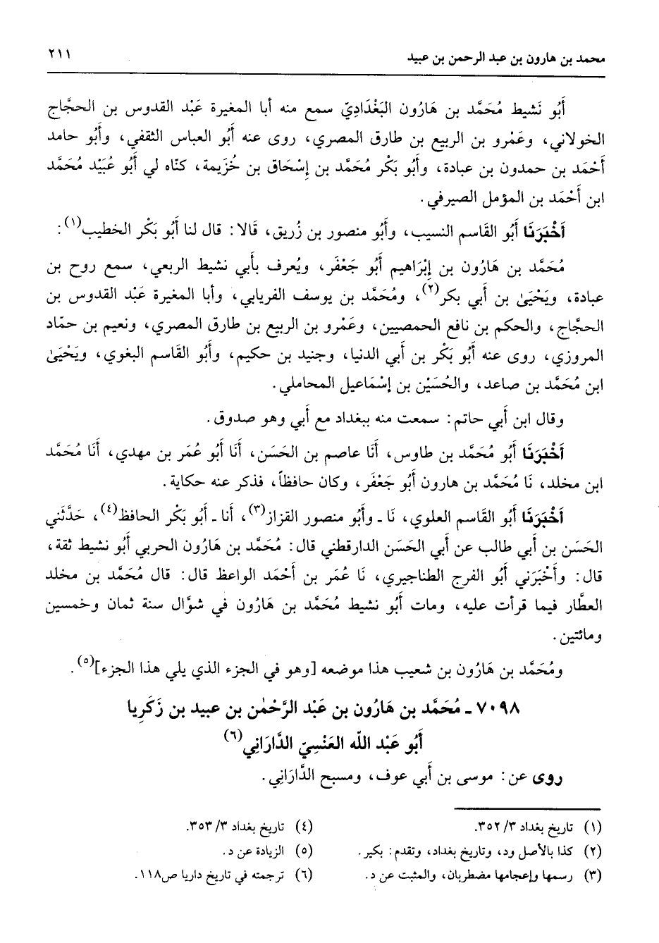 7098 - محمد بن هارون بن عبد الرحمن بن عبيد بن زكريا أبو عبد الله العنسي الداراني (6) روى عن موسى بن ابي عوف ومسبح الداراني