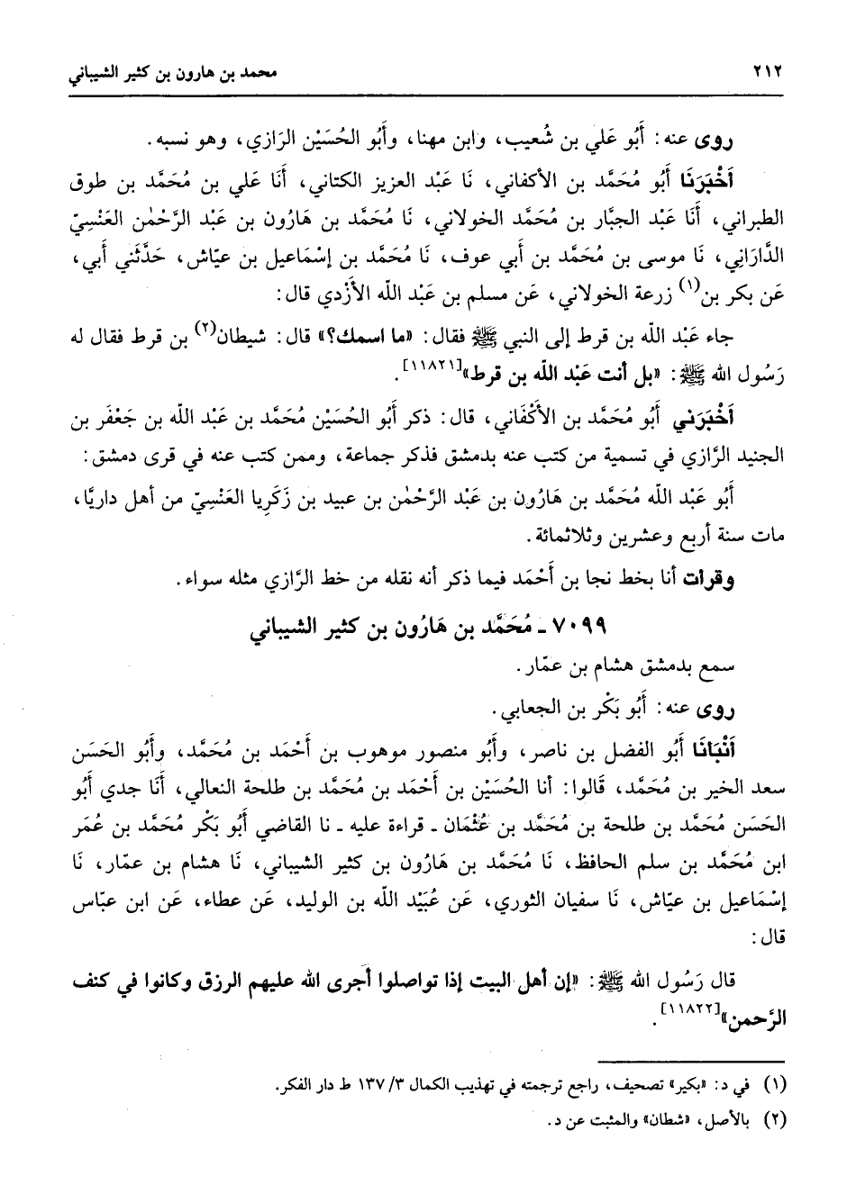 7099 - محمد بن هارون بن كثير الشيباني سمع بدمشق هشام بن عمار روى عنه أبو بكر بن الجعابي أنبأنا أبو الفضل بن ناصر وأبو منصور موهوب بن أحمد بن محمد وأبو الحسن سعد الخير بن محمد قالوا أنا الحسين بن أحمد بن محمد بن طلحة النعالي أنا جدي أبو الحسن محمد بن طلحة بن محمد بن عثمان قراءة عليه نا القاضي أبو بكر محمد بن عمر ابن محمد بن سلم الحافظ نا محمد بن هارون بن كثير الشيباني نا هشام بن عمار نا إسماعيل بن عياش نا سفيان الثوري عن عبيد الله بن الوليد عن عطاء عن ابن عباس قال قال رسول الله (صلى الله عليه وسلم) إن أهل البيت إذا تواصلوا أجرى الله عليهم الرزق وكانوا في كنف الرحمن