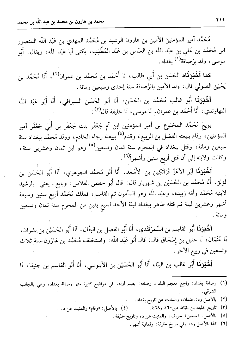 محمد أمير المؤمنين الأمين بن هارون الرشيد بن محمد المهدي بن عبد الله المنصور ابن محمد بن علي بن عبد الله بن العباس بن عبد المطلب يكنى أبا عبد الله ويقال أبو موسى ولد برصافة (1) بغداد كما أخبرناه الحسن بن أبي طالب نا أحمد بن محمد بن عمران (2) أنا محمد بن يحيى الصولي قال ولد الأمين بالرصافة سنة إحدى وسبعين ومائة أخبرنا أبو غالب محمد بن الحسن أنا أبو الحسن السيرافي أنا أبو عبد الله النهاوندي أنا أحمد بن عمران نا موسى نا خليفة قال (3) بويع محمد المخلوع بن أمير المؤمنين ابن أم جعفر بنت جعفر بن أبي جعفر أمير المؤمنين وقام ببيعته الفضل بن الربيع وقدم (4) ببيعته رجاء الخادم وولد محمد ببغداد سنة سبعين ومائة وقتل ببغداد في المحرم سنة ثمان وتسعين (5) وهو ابن ثمان وعشرين سنة وكانت ولايته إلى أنا قتل أربع سنين وأشهرا (6) أخبرنا أبو الأعز قراتكين بن الأسعد أنا أبو محمد الجوهري أنا أبو الحسن بن لؤلؤ أنا محمد بن الحسين بن شهريار قال قال أبو حفص الفلاس وبايع يعني الرشيد لابنيه محمد وأمه زبيدة وعبد الله وهو المأمون ثم القاسم فملك محمد أربع سنين وسبعة أشهر وعشرين ليلة ثم قتله طاهر ببغداد ليلة الأحد لسبع بقين من المحرم سنة ثمان وتسعين ومائة أخبرنا أبو القاسم بن السمرقندي أنا أبو الفضل بن البقال أنا أبو الحسين بن بشران نا عثمان نا حنبل بن إسحاق قال قال أبو عبد الله واستخلف محمد بن هارون سنة ثلاث وتسعين في ربيع الآخر أخبرنا أبو غالب بن البناء أنا أبو الحسين بن الأبنوسي أنا أبو القاسم بن جنيقا نا