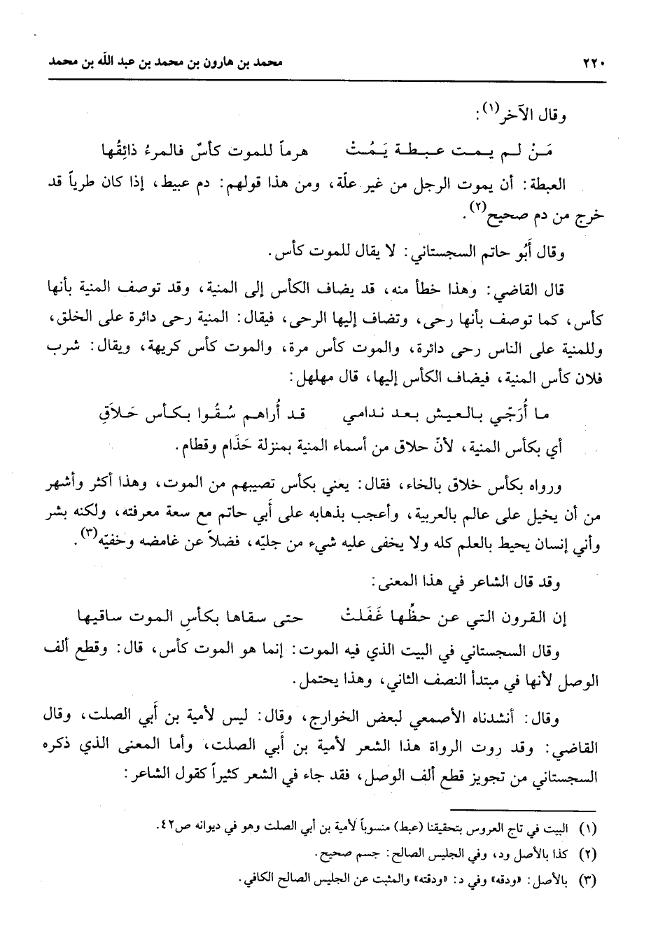 وقال الآخر (1) * من لم يمت عبطة يمت * هرما للموت كأس فالمرء ذائقها * العبطة أن يموت الرجل من غير علة ومن هذا قولهم دم عبيط إذا كان طريا قد خرج من دم صحيح (2) وقال أبو حاتم السجستاني لا يقال للموت كأس قال القاضي وهذا خطأ منه قد يضاف الكأس إلى المنية وقد توصف المنية بأنها كأس كما توصف بأنها رحى وتضاف إليها الرحى فيقال المنية رحى دائرة على الخلق وللمنية على الناس رحى دائرة والموت كأس مرة والموت كأس كريهة ويقال شرب فلان كأس المنية فيضاف الكأس إليها قال مهلهل * ما أرجي بالعيش بعد ندامي * قد اراهم سقوا بكأس خلاق * أي بكأس المنية لأن حلاق من أسماء المنية بمنزلة حذام وقطام ورواه بكأس خلاق بالخاء فقال يعني بكأس تصيبهم من الموت وهذا أكثر وأشهر من أن يخيل على عالم بالعربية وأعجب بذهابه على أبي حاتم مع سعة معرفته ولكنه بشر وأني إنسان يحيط بالعلم كله ولا يخفى عليه شئ من جليه فضلا عن غامضه وخفيه (3) وقد قال الشاعر في هذا المعنى * إن القرون التي عن حظها غفلت * حتى سقاها بكأس الموت ساقيها * وقال السجستاني في البيت الذي فيه الموت إنما هو الموت كأس إنما هو الموت كأس قال وقطع ألف الوصل لأنها في مبتدأ النصف الثاني وهذا يحتمل وقال أنشدناه الأصمعي لبعض الخوارج وقال ليس لأمية بن أبي الصلت وقال القاضي وقد روت الرواة هذا الشعر لأمية بن أبي الصلت وأما المعنى الذي ذكره السجستاني من تجويز قطع ألف الوصل فقد جاء في الشعر كثيرا كقول الشاعر