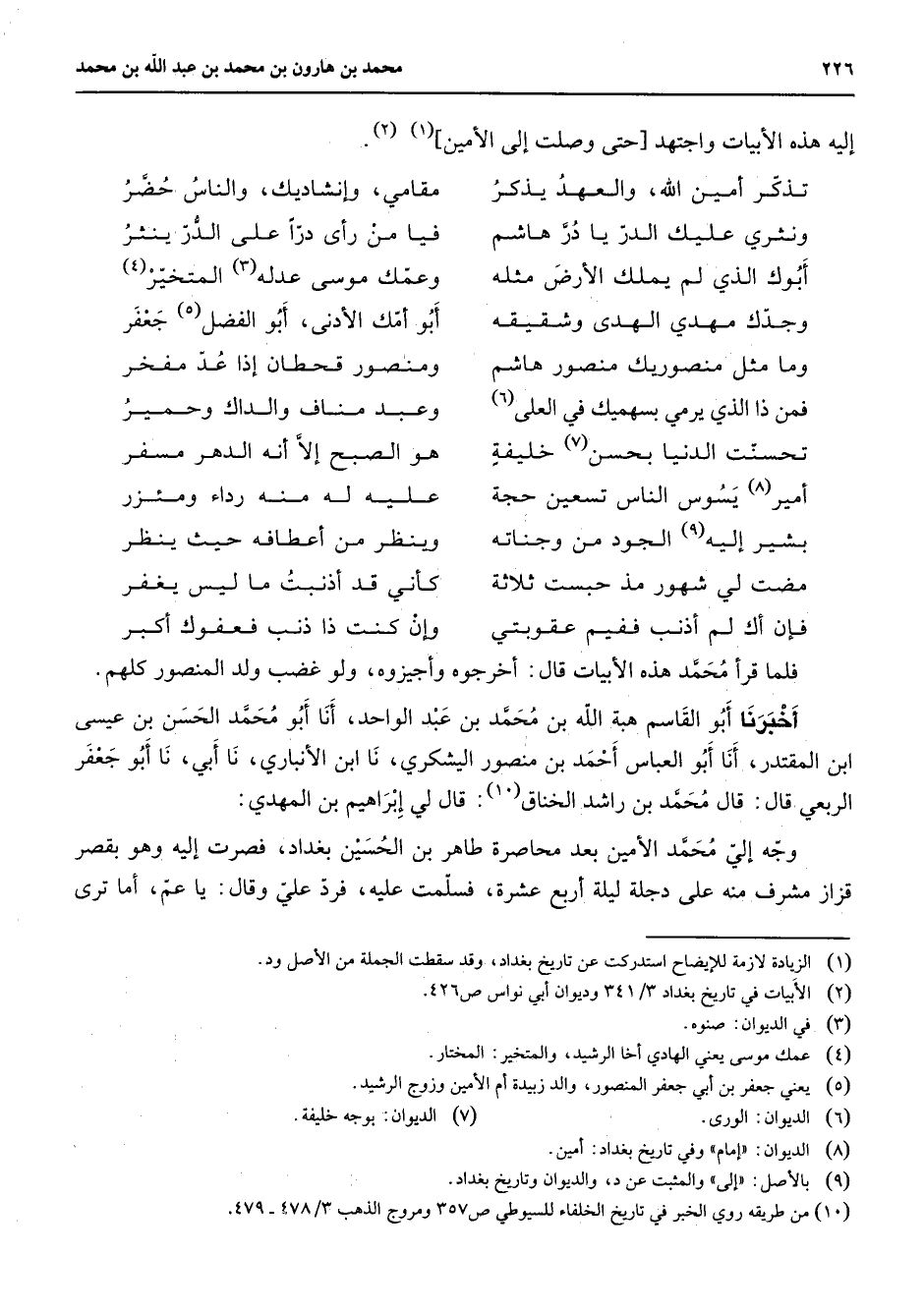 (10) من طريقه روي الخبر في تاريخ الخلفاء للسيوطي ص 357 ومروج الذهب 3 / 478 - 479