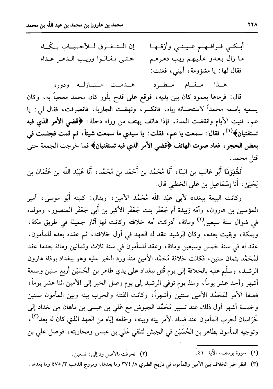 * أبكي فراقهم عيني وأرقها * إن التفرق للأحباب بكاء ما زال يعدو عليهم ريب دهرهم * حتى تفانوا وريب الدهر عداء * فقال لها يا مشؤومة أبيني فغنت * هذا مقام مطرد * هدمت منازله ودوره * قال فرماها بعمود كان بين يديه فوقع على قدح بلور كان محمد معجبا به وكان يسميه باسمه محمدا لاستحسانه إياه فانكسر ونهضت الجارية فانصرفت فقال لي يا عم فنيت الأيام وانقضت المدة فإذا هاتف يهتف من وراء دجلة " قضى الأمر الذي فيه تستفتيان " (1) فقال سمعت يا عم فقلت يا سيدي ما سمعت شيئا ثم قمت فجلست في بعض الحجر فعاد صوت الهاتف " قضى الأمر الذي فيه تسفتيان " فما خرجت الجمعة حتى قتل محمد أخبرنا أبو غالب بن البنا أنا محمد بن أحمد بن محمد أنا عبيد الله بن عثمان بن يحيى أنا إسماعيل بن علي الخطبي قال وكانت البيعة ببغداد لأبي عبد الله محمد الأمين ويقال كنيته أبو موسى أمير المؤمنين بن هارون وأمه زبيدة أم جعفر بن جعفر الأكبر بن أبي جعفر المنصور ومولده في شوال سنة سبعين (2) ومائة أدركت أمه خلافته وكانت لها آثار جميلة في طريق مكة وبمكة وبقيت بعده وكان الرشيد عقله العهد في أول خلافته ثم عقده بعده للمأمون عقد له في سنة خمس وسبعين ومائة وعقد للمأمون في سنة ثلاث وثمانين ومائة بعدما عقد لمحمد بثمان سنين فكانت خلافة محمد الأمين منذ ورد الخبر عليه وهو ببغداد بوفاة هارون الرشيد وسلم عليه بالخلافة إلى يوم قتل ببغداد على يدي طاهر بن الحسين أربع سنين وسبعة أشهر وأحد عشر يوما ومنذ يوم توفي الرشيد إلى يوم وصل الخبر إلى الأمين اثنا عشر يوما فصفا الأمر لمحمد الأمين سنتين وأشهرا وكانت الفتنة والحرب بينه وبين المأمون سنتين وخمسة أشهر أول ذلك عند تسيير محمد الجيوش مع علي بن عيسى بن ماهان من بغداد إلى خراسان لحرب المأمون عند فساد الأمر بينه وبينه وخلعه إياه من العهد الذي كان له بعد (3) وتوجيه المأمون بطاهر بن الحسين في الجيش لتلقي علي بن عيسى ومحاربته فوصل علي بن