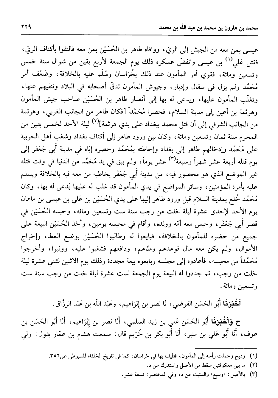 عيسى بمن معه من الجيش إلى الري ووافاه طاهر بن الحسين بمن معه فالتقوا بأكناف الري فقتل علي (1) بن عيسى وانفض عسكره ذلك يوم الجمعة لأربع بقين من شوال سنة خمس وتسعين ومائة فقوي أمر المأمون عند ذلك بخراسان وسلم عليه بالخلافة وضعف أمر محمد ولم يزل في سفال وإدبار وجيوش المأمون تدق أصحابه في البلاد وتنفيهم عنها وتغلب المأمون عليها ويدعى له بها إلى أنصار طاهر بن الحسين صاحب جيش المأمون وهرثمة بن أعين إلى مدينة السلام فحصرا محمدا فكان طاهر من الجانب الغربي وهرثمة من الجانب الشرقي إلى أن قتل محمد ببغداد على يدي هرثمة (2) ليلة الأحد لخمس بقين من المحرم سنة ثمان وتسعين ومائة وكان بين ورود طاهر إلى أكناف بغداد وشغب أهل الحربية على محمد وإدخالهم طاهر إلى بغداد وإحاطته بمحمد وحصره إياه في مدينة أبي جعفر إلى يوم قتله أربعة عشر شهرا وسبعة (3) عشر يوما ولم يبق في يد محمد من الدنيا في وقت قتله غيرا لموضع الذي هو محصور فيه من مدينة أبي جعفر يخاطبه من معه فيه بالخلافة ويسلم عليه بأمره المؤمنين وسائر المواضع في يدي المأمون قد غلب له عليها يدعى له بها وكان محمد خلع بمدينة السلام قبل ورود طاهر إليها على يدي الحسين بن علي بن عيسى بن ماهان يوم الأحد لإحدى عشرة ليلة خلت من رجب سنة ست وتسعين ومائة وحبسه الحسين في قصر أبي جعفر وحبس معه أمه وولده وأقام في محبسه يومين وأخذ الحسين البيعة على جميع من حضره للمأمون بالخلافة فبايعوا له وطالبوا الحسين بوضع العطاء وإخراج الأموال ولم يكن معه مال فوعدهم ومناهم ودافعهم فشغبوا عليه ووثبوا وأخرجوا محمدا من محبسه فأعادوه إلى مجلسه وبايعوه بيعة مجددة وذلك يوم الاثنين لثنتي عشرة ليلة خلت من رجب ثم جددوا له البيعة يوم الجمعة لست عشرة ليلة خلت من رجب سنة ست وتسعين ومائة أخبرنا أبو الحسن الفرضي نا نصر بن إبراهيم وعبد الله بن عبد الرزاق وأخبرنا أبو الحسن علي بن زيد السلمي أنا نصر بن إبراهيم أنا أبو الحسن بن عوف أنا أبو علي بن منير أنا أبو بكر بن خريم قال سمعت هشام بن عمار يقول ولي