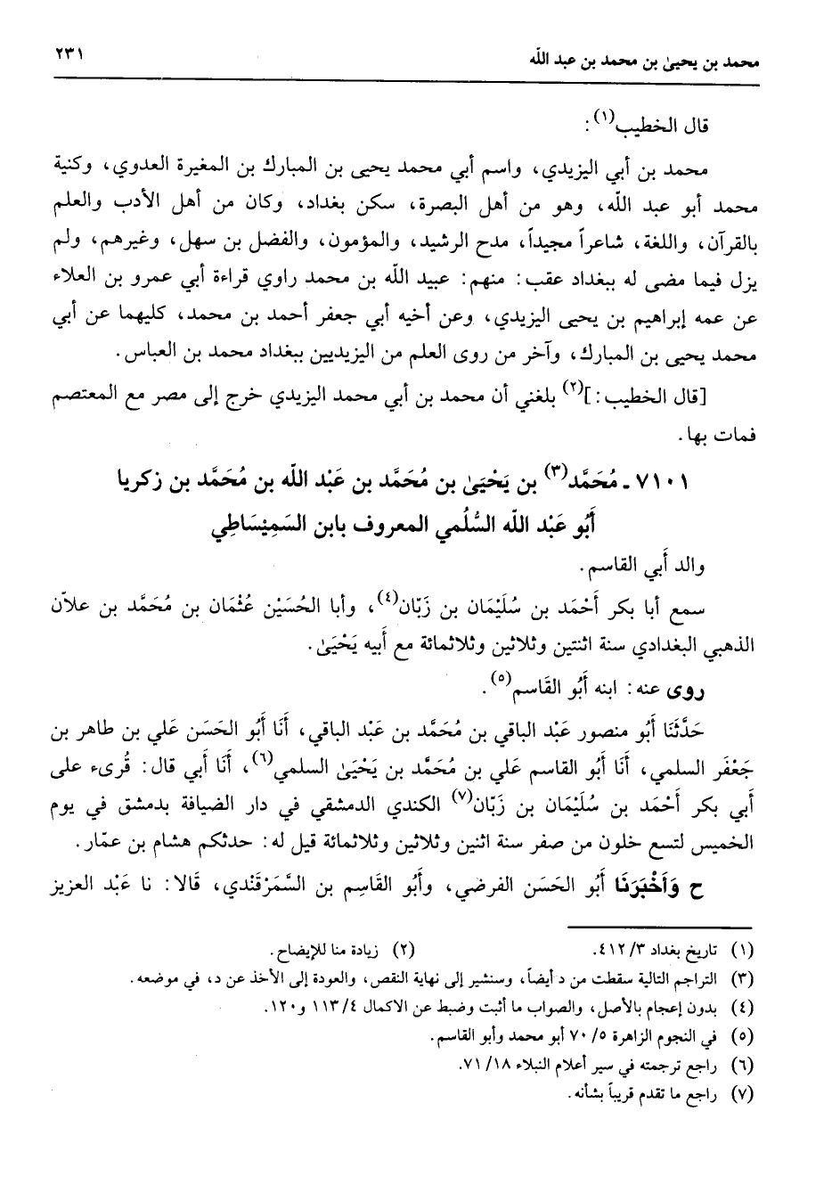 7101 - محمد (3) بن يحيى بن محمد بن عبد الله بن محمد بن زكريا أبو عبد الله السلمي المعروف بابن السميساطي والد أبي القاسم سمع أبا بكر أحمد بن سليمان بن زبان (4) وأبا الحسين عثمان بن محمد بن علان الذهبي البغدادي سنة اثنتين وثلاثين وثلاثمائة مع أبيه يحيى روى عنه ابنه أبو القاسم (5) حدثنا أبو منصور عبد الباقي بن محمد بن عبد الباقي أنا أبو الحسن علي بن طاهر بن جعفر السلمي أنا أبو القاسم علي بن محمد بن يحيى السلمي (6) أنا أبي قال قرئ على أبي بكر أحمد بن سليمان بن زبان (7) الكندي الدمشقي في دار الضيافة بدمشق في يوم الخميس لتسع خلون من صفر سنة اثنين وثلاثين وثلاثمائة قيل له حدثكم هشام بن عمار وأخبرنا أبو الحسن الفرضي وأبو القاسم بن السمرقندي قالا نا عبد العزيز