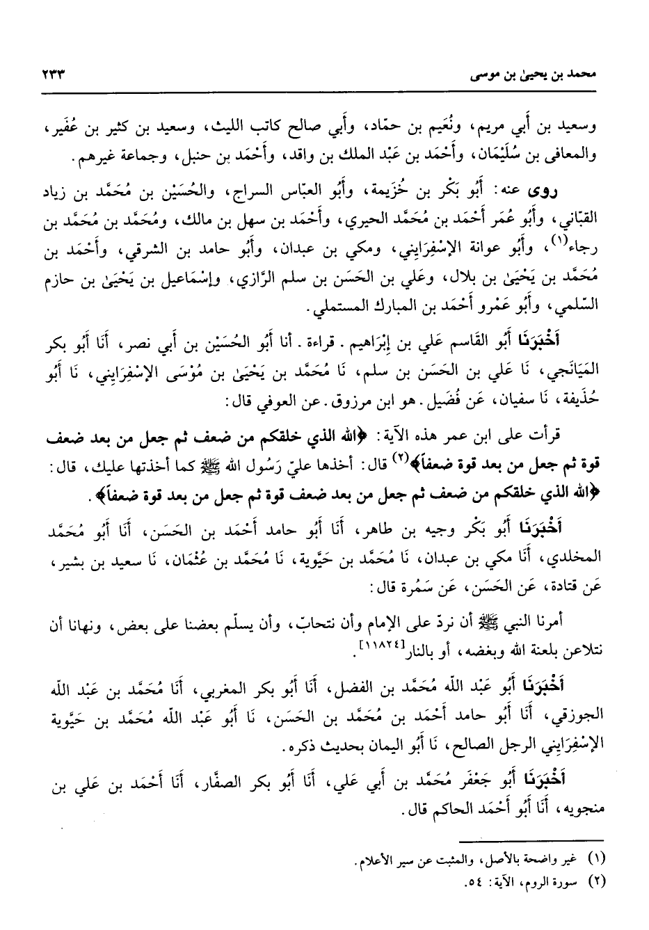 وسعيد بن أبي مريم ونعيم بن حماد وأبي صالح كاتب الليث وسعيد بن كثير بن عفير والمعافى بن سليمان وأحمد بن عبد الملك بن واقد وأحمد بن حنبل وجماعة غيرهم روى عنه أبو بكر بن خزيمة وأبو العباس السراج والحسين بن محمد بن زياد القباني وأبو عمر أحمد بن محمد الحيري وأحمد بن سهل بن مالك ومحمد بن محمد بن رجاء (1) وأبو عوانة الإسفرايني ومكي بن عبدان وأبو حامد بن الشرقي وأحمد بن محمد بن يحيى بن بلال وعلي بن الحسن بن سلم الرازي وإسماعيل بن يحيى بن حازم السلمي وأبو عمرو أحمد بن المبارك المستملي أخبرنا أبو القاسم علي بن إبراهيم قراءة أنا أبو الحسين بن أبي نصر أنا أبو بكر الميانجي نا علي بن الحسن بن سلم نا محمد بن يحيى بن موسى الإسفرايني نا أبو حذيفة نا سفيان عن فضيل هو ابن مرزوق عن العوفي قال قرأت على ابن عمر هذه الآية " الله الذي خلقكم من ضعف ثم جعل من بعد ضعف قوة ثم جعل من بعد قوة ضعفا " (2) قال أخذها علي رسول الله (صلى الله عليه وسلم) كما أخذتها عليك قال " الله الذي خلقكم من ضعف ثم جعل من بعد ضعف قوة ثم جعل من بعد قوة ضعفا " أخبرنا أبو بكر وجيه بن طاهر أنا أبو حامد أحمد بن الحسن أنا أبو محمد المخلدي أنا مكي بن عبدان نا محمد بن حيوية نا محمد بن عثمان نا سعيد بن بشير عن قتادة عن الحسن عن سمرة قال أمرنا النبي (صلى الله عليه وسلم) أننرد على الإمام وأن نتحاب وأن يسلم بعضنا على بعض ونهانا أنا إ نتلاعن بلعنة الله وبغضه أو بالنار أخبرنا أبو عبد الله محمد بن الفضل أنا أبو بكر المغربي أنا محمد بن عبد الله الجوزقي أنا أبو حامد أحمد بن محمد بن الحسن نا أبو عبد الله محمد بن حيوية الإسفرايني الرجل الصالح نا أبو اليمان بحديث ذكره أخبرنا أبو جعفر محمد بن أبي علي أنا أبو بكر الصفار أنا أحمد بن علي بن منجوية أنا أبو أحمد الحاكم قال
