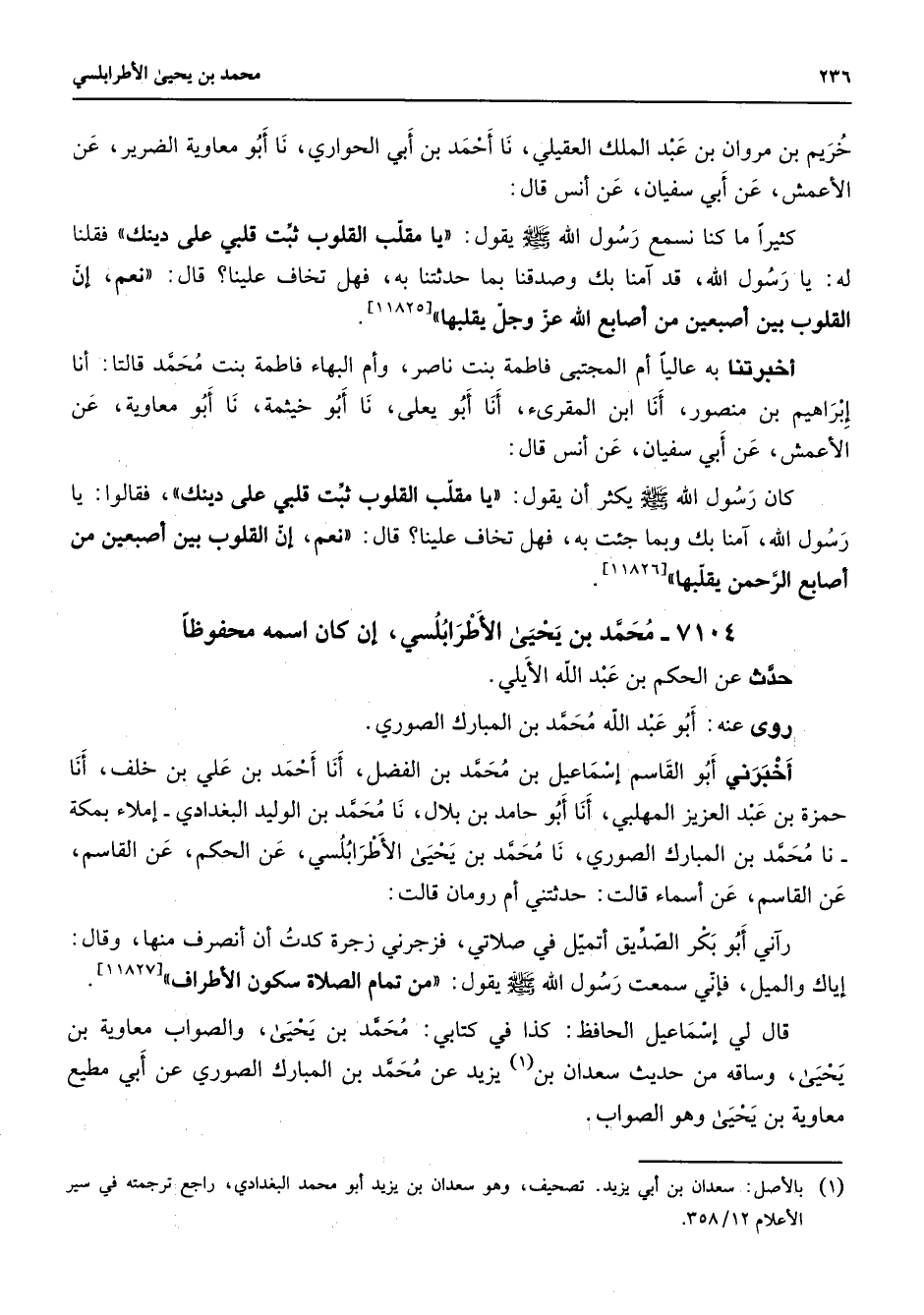 7104 - محمد بن يحيى الأطرابلسي إن كان اسمه محفوظا حدث عن الحكم بن عبد الله الأيلي روى عنه أبو عبد الله محمد بن المبارك الصوري أخبرني أبو القاسم إسماعيل بن محمد بن الفضل أنا أحمد بن علي بن خلف أنا حمزة بن عبد العزيز المهلبي أنا أبو حامد بن بلال نا محمد بن الوليد البغدادي إملاء بمكة نا محمد بن المبارك الصوري نا محمد بن يحيى الأطرابلسي عن الحكم عن القاسم عن القاسم عن أسماء قلت حدثتني أم رومان قالت رآني أبو بكر الصديق أتميل في صلاتي فزجرني زجرة كدت أن أنصرف منها وقال إياك والميل فإني سمعت رسول الله (صلى الله عليه وسلم) يقول من تمام الصلاة سكون الأطراف قال لي إسماعيل الحافظ كذا في كتابي محمد بن يحيى والصواب معاوية بن يحيى وساقه من حديث سعدان (1) بن يزيد عن محمد بن المبارك الصوري عن أبي مطيع معاوية بن يحيى وهو الصواب