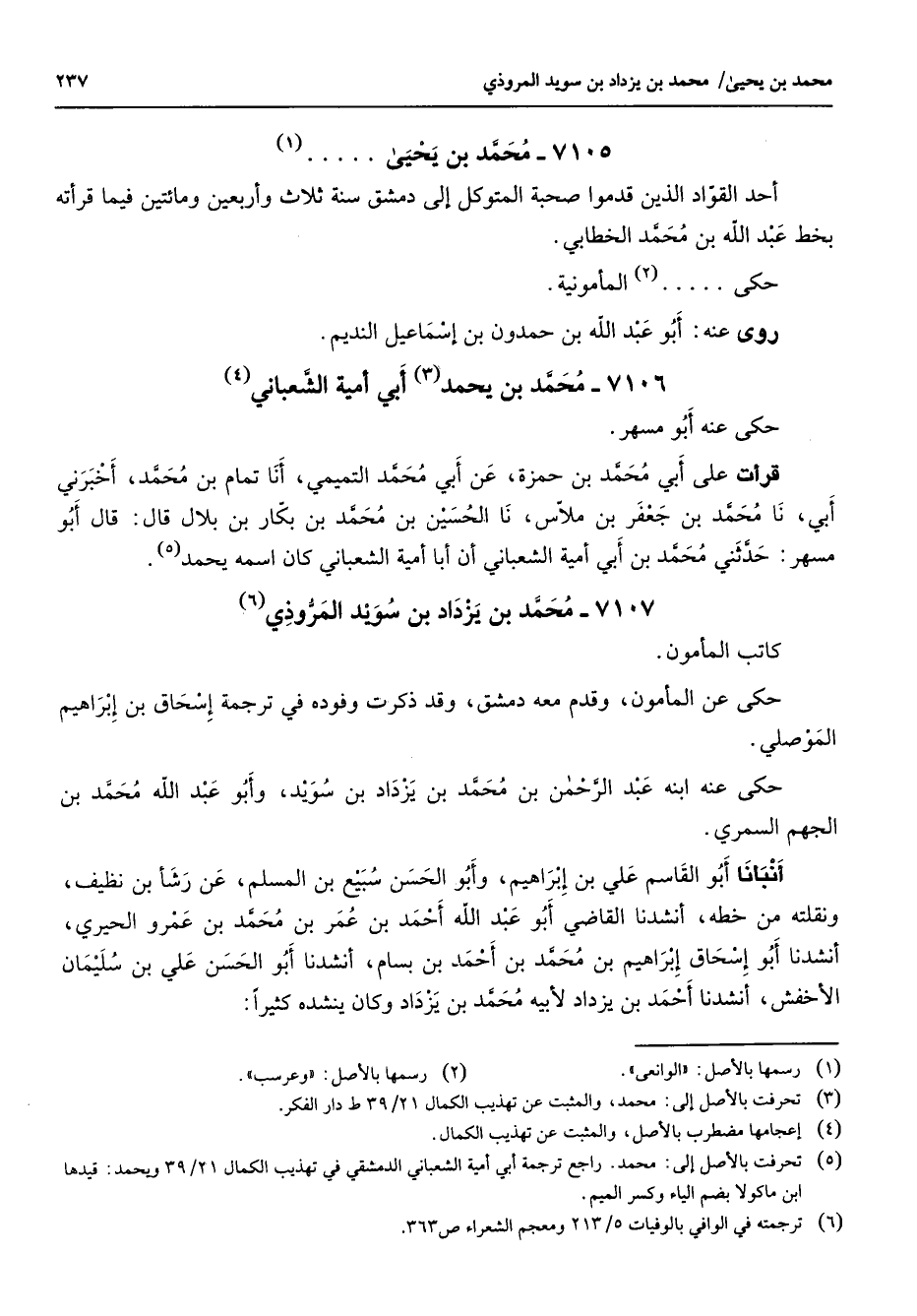 7106 - محمد بن يحمد (3) أبي أمية الشعباني (4) حكى عنه أبو مسهر قرأت على أبي محمد بن حمزة عن أبي محمد التميمي أنا تمام بن محمد أخبرني أبي نا محمد بن جعفر بن ملاس نا الحسين بن محمد بن بكار بن بلال قال قال أبو مسهر حدثني محمد بن أبي أمية الشعباني أنا أبا أمية الشعباني كان اسمه يحمد (5)