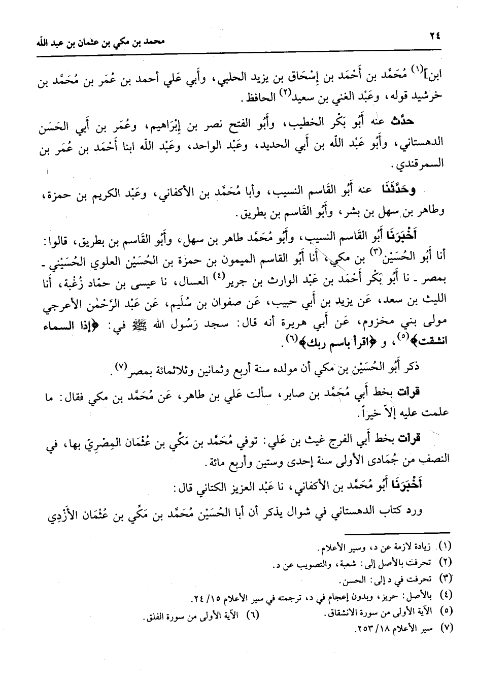 ابن (1) محمد بن أحمد بن إسحاق بن يزيد الحلبي وأبي علي أحمد بن عمر بن محمد بن خرشيد قوله وعبد الغني بن سعيد (2) الحافظ حدث عنه أبو بكر الخطيب وأبو الفتح نصر بن إبراهيم وعمر بن أبي الحسن الدهستاني وابو عبد الله بن أبي الحديد وعبد الواحد وعبد الله ابنا احمد بن عمر بن السمرقندي وحدثنا عنه أبو القاسم النسيب وأبا محمد بن الأكفاني وعبد الكريم بن حمزة وطاهر بن سهل بن بشر وأبو القاسم بن بطريق أخبرنا أبو القاسم النسيب وأبو محمد طاهر بن سهل وأبو القاسم بن بطريق قالوا أنا أبو الحسين (3) بن مكي أنا أبو القاسم الميمون بن حمزة بن الحسين العلوي الحسيني بمصر نا أبو بكر أحمد بن عبد الوارث بن جرير (4) العسال نا عيسى بن حماد زغبة أنا الليث بن سعد عن يزيد بن أبي حبيب عن صفوان بن سليم عن عبد الرحمن الأعرجي مولى بني مخزوم عن أبي هريرة أنه قال سجد رسول الله (صلى الله عليه وسلم) في " إذا السماء انشقت " (5) و " اقرأ باسم ربك " (6) ذكر أبو الحسين بن مكي أن مولده سنة أربع وثمانين وثلاثمائة بمصر (7) قرأت بخط أبي محمد بن صابر سألت علي بن طاهر عن محمد بن مكي فقال ما علمت عليه إلا خيرا قرأت بخط أبى الفرج غيث بن علي توفي محمد بن مكي بن عثمان المصري بها في النصف من جمادى الأولى سنة إحدى وستين وأربع مائة أخبرنا أبو محمد بن الأكفاني نا عبد العزيز الكتاني قال ورد كتاب الدهستاني في شوال يذكر أن أبا الحسين محمد بن مكي بن عثمان الأزدي