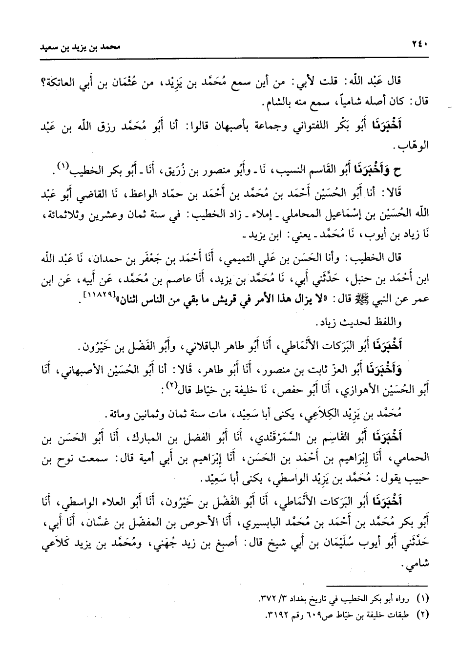 قال عبد الله قلت لأبي من أين سمع محمد بن يزيد من عثمان بن أبي العاتكة قال كان أصله شاميا سمع منه بالشام أخبرنا أبو بكر اللفتواني وجماعة بأصبهان قالوا أنا أبو محمد رزق الله بن عبد الوهاب وأخبرنا أبو القاسم النسيب نا وأبو منصور بن زريق أنا أبو بكر الخطيب قالا أنا أبو الحسين أحمد بن محمد بن أحمد بن حماد الواعظ نا القاضي أبو عبد الله الحسين بن إسماعيل المحاملي إملاء زاد الخطيب في سنة ثمان وعشرين وثلاثمائة نا زياد بن أيوب نا محمد يعني ابن يزيد قال الخطيب وأنا الحسن بن علي التميمي أنا أحمد بن جعفر بن حمدان نا عبد الله ابن أحمد بن حنبل حدثني أبي نا محمد بن يزيد أنا عاصم بن محمد عن أبيه عن ابن عمر عن النبي (صلى الله عليه وسلم) قال لا يزال هذا الأمر في قريش ما بقي من الناس اثنان واللفظ لحديث زياد أخبرنا أبو البركات الأنماطي أنا أبو طاهر الباقلاني وأبو الفضل بن خيرون وأخبرنا أبو العز ثابت بن منصور أنا أبو طاهر قالا أنا أبو الحسين الأصبهاني أنا أبو الحسين الأهوازي أنا أبو حفص نا خليفة بن خياط قال (2) محمد بن يزيد الكلاعي يكنى أبا سعيد مات سنة ثمان وثمانين ومائة أخبرنا أبو القاسم بن السمرقندي أنا أبو الفضل بن المبارك أنا أبو الحسن بن الحمامي أنا إبراهيم بن أحمد بن الحسن أنا إبراهيم بن أبي أمية قال سمعت نوح بن حبيب يقول محمد بن يزيد الواسطي يكنى أبا سعيد أخبرنا أبو البركات الأنماطي أنا أبو الفضل بن خيرون أنا أبو العلاء الواسطي أنا أبو بكر محمد بن أحمد بن محمد البابسيري أنا الأحوص بن المفضل بن غسان أنا أبي حدثني أبو أيوب سليمان بن أبي شيخ قال أصبغ بن زيد جهني ومحمد بن يزيد كلاعي شامي