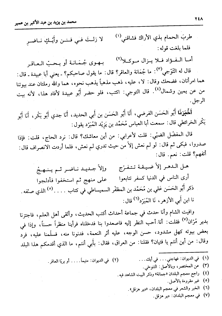 * طرب الحمام بذي الأراك فشاقني (1) * لا زلت في فنن وأيك ناضر * فلما بلغت قوله * أما الفؤاد فلا يزال موكلا (2) * بهوى جمانة أو بحب العاقر * قال له التوجي (3) ما جمانة والعاقر قال ما يقول صاحبكم يعني أبا عبيد قال هما امرأتان فضحك وقال لا عليه ذهب مذهبا يذهب نحوه هما والله رملتان عند بيوتنا من عن يمين وشمال (4) قال التوجي اكتب فلو حضر أبو عبيدة لأفاد هذا لأنه بيت الرجل أخبرنا أبو الحسن الفرضي أنا أبو الحسن بن أبي الحديد أنا جدي أبو بكر أنا أبو بكر الخرائطي قال سمعت أبا العباس محمد بن يزيد المبرد يقول قال المفضل الضبي قلت لأعرابي من أين معاشك قال نرد الحاج قلت فإذا صدروا فبكى ثم قال لو لم نعش إلا من حيث تدري لم نعش فلما أردت الانصراف قال أتفهم قلت نعم قال * هل الدهر إلا ضيقة تتفرج * وإلا جديد ناضر ثم ينهج أرى الناس في الدنيا كسفر تتابعوا * على منهج ثم استخفوا فأدلجوا * ذكر أبو الحسن علي بن محمد بن المظفر السميساطي في كتاب (5) الذي صنفه نا ابن أبي الأزهر نا المبرد (6) قال وافيت الشام وأنا حدث في جماعة أحداث أكتب الحديث وألقى أهل العلم فاجتزنا بدير مران (7) فقلت أنا أحب النظر إليه فاصعدوا بنا فدخلناه فرأينا منظرا حسنا وإذا في بعض بيوته كهل مشدود حسن الوجه عليه أثر النعمة فدنونا منه فسلمنا عليه فرد وقال من أين أنتم يا فتيان فقلنا من العراق فقال بأبي أنتم ما الذي أقدمكم هذا البلد