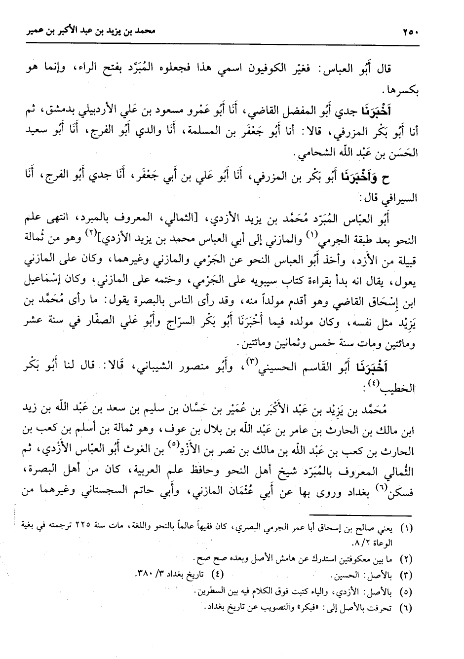 قال أبو العباس فغير الكوفيون اسمي هذا فجعلوه المبرد بفتح الراء وإنما هو بكسرها أخبرنا جدي أبو المفضل القاضي أنا أبو عمرو مسعود بن علي الأردبيلي بدمشق ثم أنا أبو بكر المزرفي قالا أنا أبو جعفر بن المسلمة أنا والدي أبو الفرج أنا أبو سعيد الحسن بن عبد الله الشحامي وأخبرنا أبو بكر بن المزرفي أنا أبو علي بن أبي جعفر أنا جدي أبو الفرج أنا السيرافي قال أبو العباس المبرد محمد بن يزيد الأزدي الثمالي المعروف بالمبرد انتهى علم النحو بعد طبقة الجرمي (1) والمازني إلى أبي العباس محمد بن يزيد الأزدي (2) وهو من ثمالة قبيلة من الأزد وأخذ أبو العباس النحو عن الجرمي والمازني وغيرهما وكان على المازني يعول يقال إنه بدأ بقراءة كتاب سيبويه على الجرمي وختمه على المازني وكان إسماعيل ابن إسحاق القاضي وهو أقدم مولدا منه وقد رأى الناس بالبصرة يقول ما رأى محمد بن يزيد مثل نفسه وكان مولده فيما أخبرنا أبو بكر السراج وأبو علي الصفار في سنة عشر ومائتين ومات سنة خمس وثمانين ومائتين أخبرنا أبو القاسم الحسيني (3) وأبو منصور الشيباني قالا قال لنا أبو بكر الخطيب (4) محمد بن يزيد بن عبد الأكبر بن عمير بن حسان بن سليم بن سعد بن عبد الله بن زيد ابن مالك بن الحارث بن عامر بن عبد الله بن بلال بن عوف وهو ثمالة بن أسلم بن كعب بن الحارث بن كعب بن عبد الله بن مالك بن نصر بن الأزد (5) بن الغوث أبو العباس الأزدي ثم الثمالي المعروف بالمبرد شيخ أهل النحو وحافظ علم العربية كان من أهل البصرة فسكن (6) بغداد وروى بها عن أبي عثمان المازني وأبي حاتم السجستاني وغيرهما من