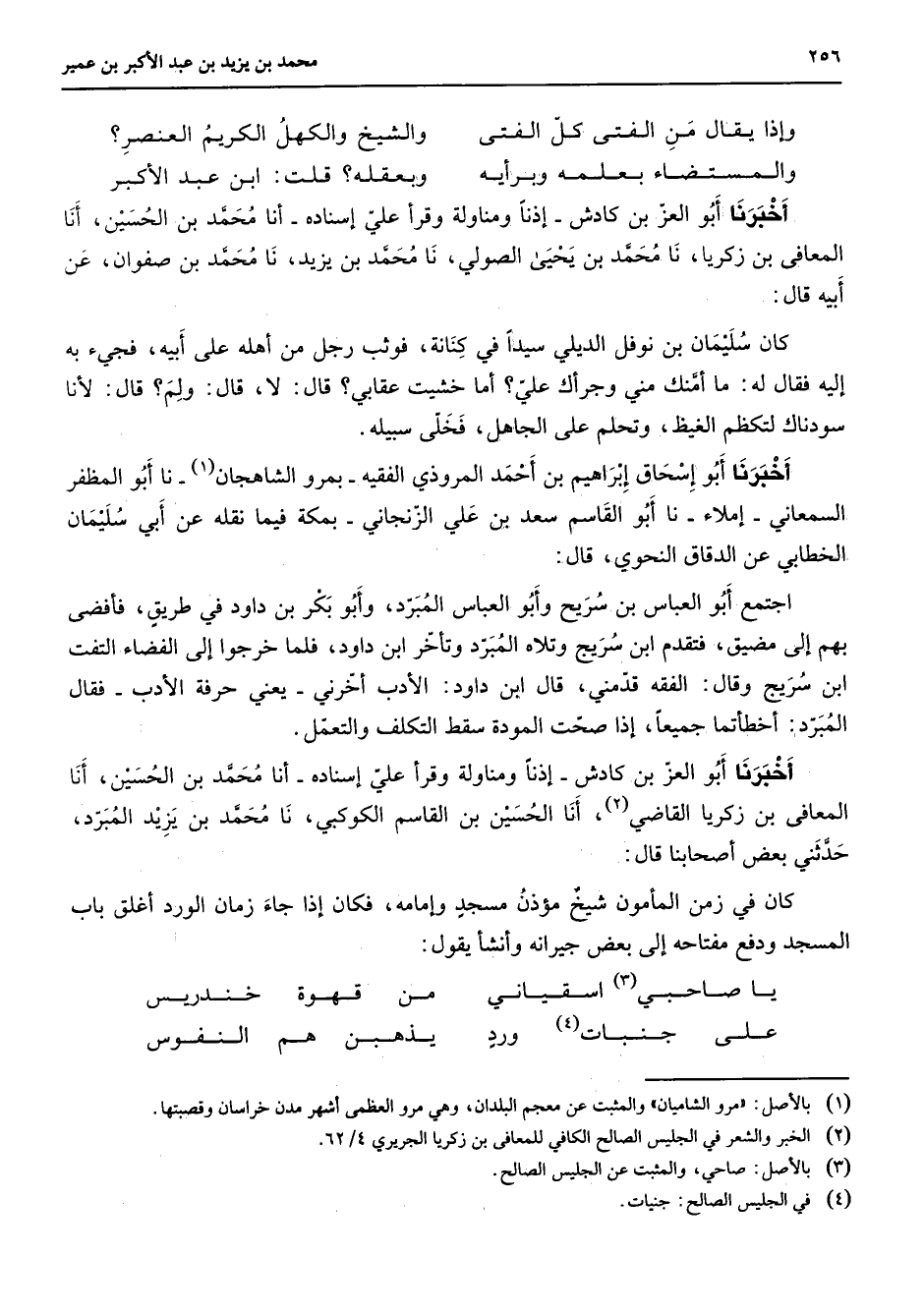 * وإذا يقال من الفتى كل الفتى * والشيخ والكهل الكريم العنصر والمستضاء بعلمه وبرأيه * وبعقله قلت ابن عبد الأكبر * أخبرنا أبو العز بن كادش إذنا ومناولة وقرأ علي إسناده أنا محمد بن الحسين أنا المعافى بن زكريا نا محمد بن يحيى الصولي نا محمد بن يزيد نا محمد بن صفوان عن أبيه قال كان سليمان بن نوفل الديلي سيدا في كنانة فوثب رجل من أهله على أبيه فجئ به إليه فقال له ما أمنك مني وجرأك علي أما خشيت عقابي قال لا قال ولم قال لأنا سودناك لتكظم الغيظ وتحلم على الجاهل فخلى سبيله أخبرنا أبو إسحاق إبراهيم بن أحمد المروذي الفقيه بمرو الشاهجان (1) نا أبو المظفر السمعاني إملاء نا أبو القاسم سعد بن علي الزنجاني بمكة فيما نقله عن أبي سليمان الخطابي عن الدقاق النحوي قال اجتمع أبو العباس بن سريج وأبو العباس المبرد وأبو بكر بن داود في طريق فأفضى بهم إلى مضيق فتقدم ابن سريج وتلاه المبرد وتأخر ابن داود فلما خرجوا إلى الفضاء التفت ابن سريج وقال الفقه قدمني قال ابن داود الأدب أخرني يعني حرفة الأدب فقال المبرد أخطأتما جميعا إذا صحت المودة سقط التكلف والتعمل أخبرنا أبو العز بن كادش إذنا ومناولة وقرأ علي إسناده أنا محمد بن الحسين انا المعافى بن زكريا القاضي (2) أنا الحسين بن القاسم الكوكبي نا محمد بن يزيد المبرد حدثني بعض أصحابنا قال كان في زمن المأمون شيخ مؤذن مسجد وإمامه فكان إذا جاء زمان الورد أغلق باب المسجد ودفع مفتاحه إلى بعض جيرانه وأنشأ يقول * يا صاحبي (3) اسقياني * من قهوة خندريس على جنبات (4) ورد * يذهبن هم النفوس