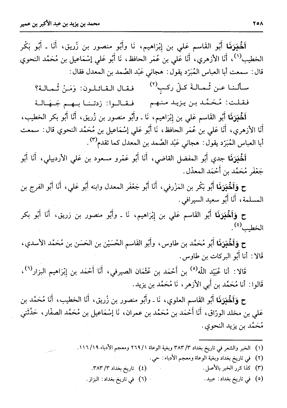 أخبرنا أبو القاسم علي بن إبراهيم نا وأبو منصور بن زريق أنا أبو بكر الخطيب (1) أنا الأزهري أنا علي بن عمر الحافظ نا أبو علي إسماعيل بن محمد النحوي قال سمعت أبا العباس المبرد يقول هجاني عبد الصمد بن المعدل فقال * سألنا عن ثمالة كل ركب * (2) فقال القائلون ومن ثمالة * * فقلت محمد بن يزيد منهم * فقالوا زدتنا بهم جهالة * أخبرنا أبو القاسم علي بن إبراهيم نا وأبو منصور بن زريق أنا أبو بكر الخطيب أنا الأزهري أنا علي بن عمر الحافظ نا أبو علي إسماعيل بن محمد النحوي قالت سمعت أبا العباس المبرد يقول هجاني عبد الصمد بن المعدل كما تقدم (3) أخبرنا جدي أبو المفضل القاضي أنا أبو عمرو مسعود بن علي الأردبيلي أنا أبو جعفر محمد بن أحمد المعدل وأخبرنا أبو بكر بن المزرفي أنا أبو جعفر المعدل وابنه أبو علي أنا أبو الفرج بن المسلمة أنا أبو سعيد السيرافي وأخبرنا أبو القاسم علي بن إبراهيم نا وأبو منصور بن زريق أنا أبو بكر الخطيب (4) وأخبرنا أبو محمد بن طاووس وأبو القاسم الحسين بن الحسن بن محمد الأسدي قالا أنا أبو البركات بن طاووس قالا أنا عبيد الله (5) بن أحمد بن عثمان الصيرفي أنا أحمد بن إبراهيم البزار قالوا أنا محمد بن أبي الأزهر نا محمد بن يزيد وأخبرنا أبو القاسم العلوي نا وأبو منصور بن زريق أنا الخطيب أنا محمد بن علي بن مخلد الوراق أنا أحمد بن محمد بن عمران نا إسماعيل بن محمد الصفار حدثني محمد بن يزيد النحوي