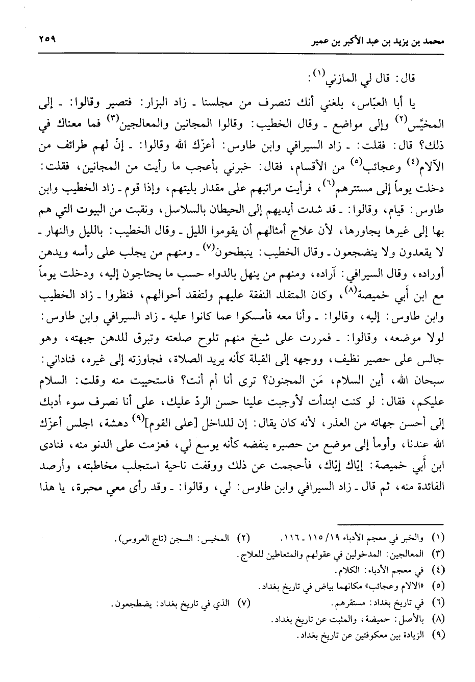 قال قال لي المازني (1) يا أبا العباس بلغني أنك تنصرف من مجلسنا زاد البزار فتصير وقالوا إلى المخيس (2) وإلى مواضع وقال الخطيب وقالوا المجانين والمعالجين فما معناك في ذلك قال فقلت زاد السيرافي وابن طاووس أعزك الله وقالوا إن لهم طرائف من الآلام (4) وعجائب (5) من الأقسام فقال خبرني بأعجب ما رأيت من المجانين فقلت دخلت يوما إلى مستترهم (6) فرأيت مراتبهم على مقدار بليتهم وإذا قوم زاد الخطيب وابن طاووس قيام وقالوا قد شدت أيديهم إلى الحيطان بالسلاسل ونقبت من البيوت التي هم بها إلى غيرها ما يجاورها لأن علاج أمثالهم أن يقوموا الليل وقال الخطيب بالليل والنهار لا يقعدون ولا ينضجعون وقال الخطيب ينبطحون (7) ومنهم من يجلس على رأسه ويدهن أوراده وقال السيرافي آراده ومنهم من ينهل بالدواء حسب ما يحتاجون إليه ودخلت يوما مع ابن أبي خميصة (8) وكان المتقلد النفقة عليهم ولتفقد أحوالهم فنظروا زاد الخطيب وابن طاووس إليه وقالوا وأنا معه فأمسكوا عما كانوا عليه زاد السيرافي وابن طاووس لولا موضعه وقالوا فمررت على شيخ منهم تلوح صلعته وتبرق للدهن جبهته وهو جالس على حصير نظيف ووجهه إلى القبلة كأنه يريد الصلاة فجاوزته إلى غيره فناداني سبحان الله أين السلام من المجنون ترى أنا أم انت فاستحييت منه وقلت السلام عليكم فقال لو كنت ابتدأت لأوجبت علينا حسن الرد عليك على أنا نصرف سوء أدبك إلى أحسن جهاته من العذر لأنه كان يقال إن للداخل على القوم (9) دهشة اجلس أعزك الله عندنا وأومأ إلى موضع من حصيره ينفضه كأنه يوسع لي فعزمت على الدنو منه فنادى ابن أبي خميصة إياك إياك فأحجمت عن ذلك ووقفت ناحية أستجلب مخاطبته وأرصد الفائدة منه ثم قال زاد السيرافي وابن طاووس لي وقالوا وقد رأى معي محبرة يا هذا