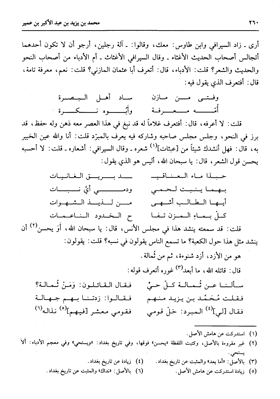 أرى زاد السيرافي وابن طاووس معك وقالوا آلة رجلين أرجو أن لا تكون أحدهما أتجالس أصحاب الحديث الأغثاء وقال السيرافي الأغثاء أم الأدبامن أصحاب النحو والحديث والشعر قلت الأدباء قال أتعرف أبا عثمان المازن قلت نعم معرفة تامة قال أفتعرف الذي يقول فيه * وفتى من مازن * ساد أهل البصرة أمه معرفة * وأبوه نكرة * قلت لا أعرفه قال أفتعرف غلاما له قد نبغ في هذا العصر معه ذهن وله حفظ قد برز في النحو وجلس مجلس صاحبه وشاركه فيه يعرف بالمبرد قلت أنا والله عين الخبير به قال فهل أنشدك شيئا من عبثات (1) شعره وقال السيرافي أشعاره قلت لا أحسبه يحسن قول الشعر قال يا سبحان الله أليس هذا الذي يقول * حبذا ماء العناقي * د بريق الغانيات بهما ينبت لحمي * ودمي أي نبات أيها الطالب أشهى * من لذيذ الشهوات كل بماء المزن تفا * الخدود الناعمات * قلت قد سمعته ينشد هذا في مجلس الأنس قال يا سبحان الله أو يحسن أن ينشد مثل هذا حول الكعبة ما تسمع الناس يقولون في نسبه قلت يقولون هو من الأزد أزد شنوءة ثم من ثمالة قال قاتله الله ما أبعد (3) غوره أتعرف قوله * سألنا عن ثمالة كل حي * فقال القائلون ومن ثمالة فقلت محمد بن يزيد منهم * فقالوا زدتنا بهم جهالة فقال لي (4) المبرد خل قومي * فقومي معشر فيهم (5) نذالة (6) *